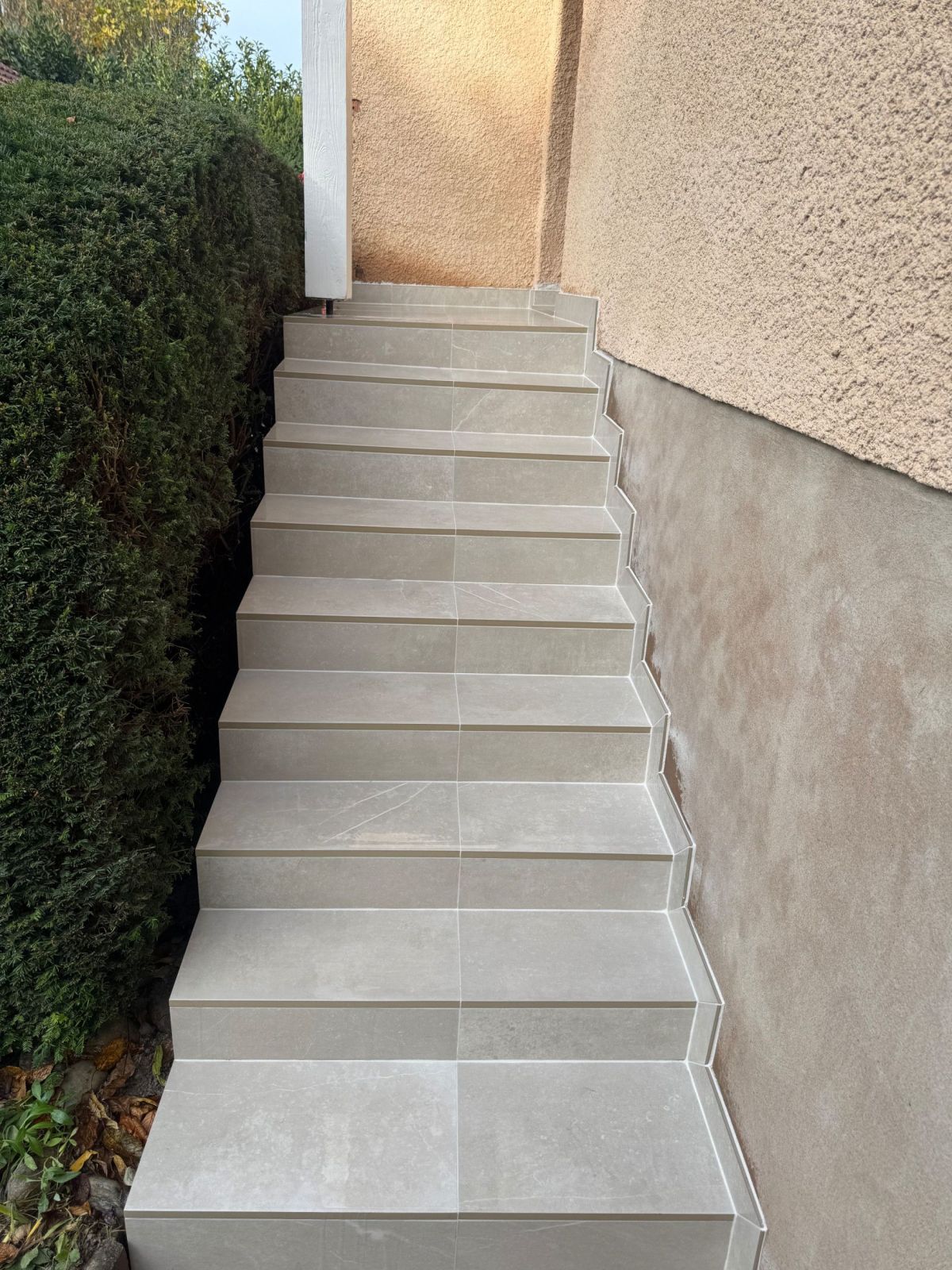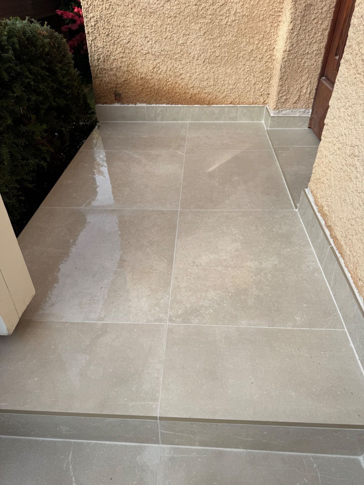 GERBER SAS a rénové cet accès extérieur en utilisant un carrelage robuste et élégant, parfaitement adapté aux zones exposées. Le choix des dalles Kainos Bone offre un rendu contemporain tout en garantissant une excellente résistance et une finition soignée.