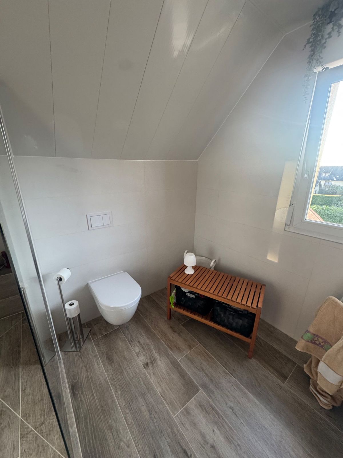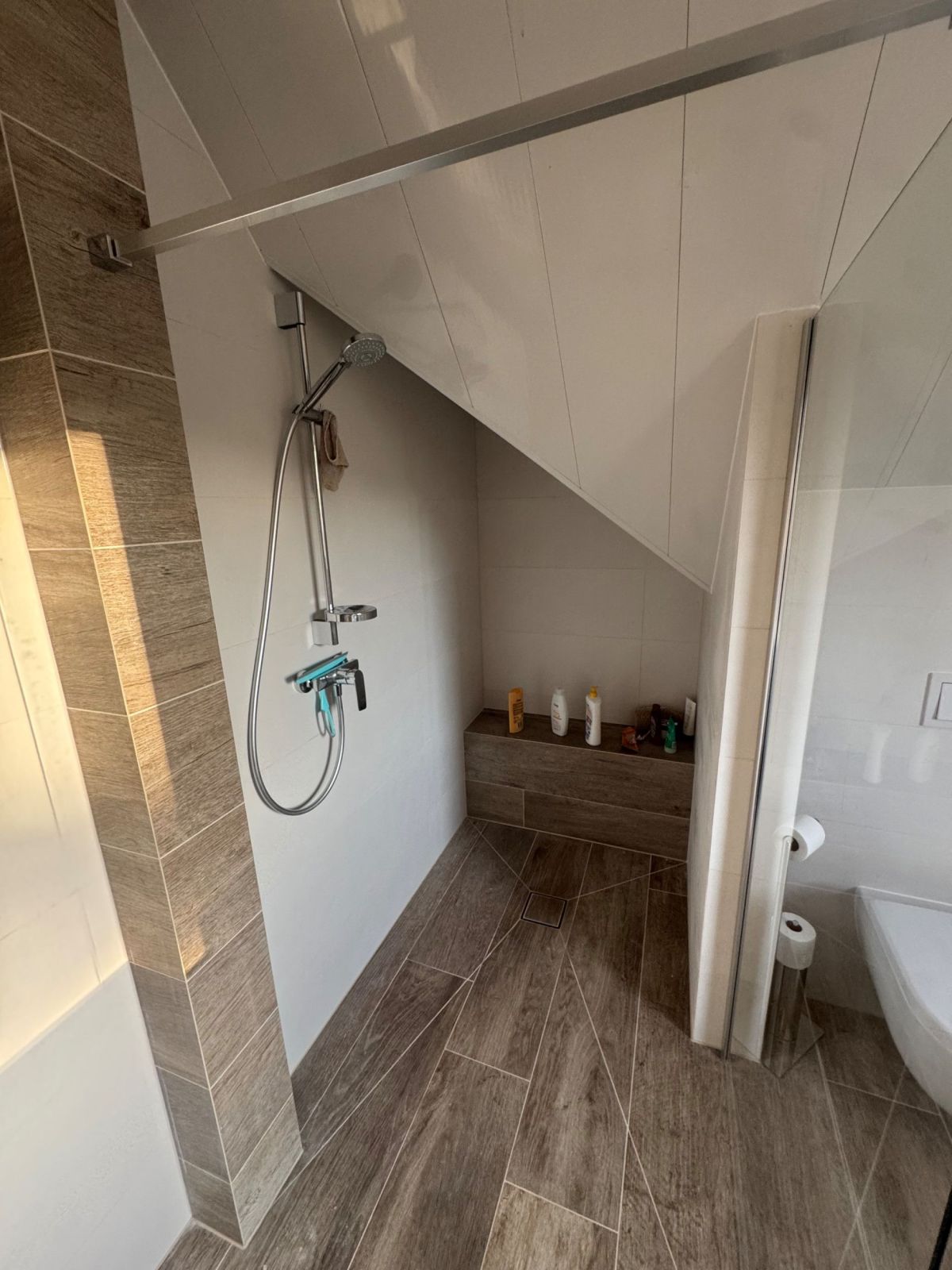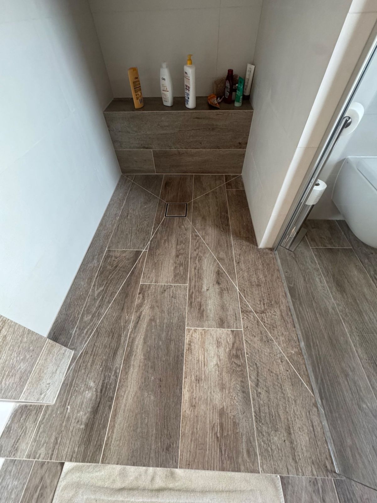 Aménagement d’un espace douche sous pente avec carrelage effet bois