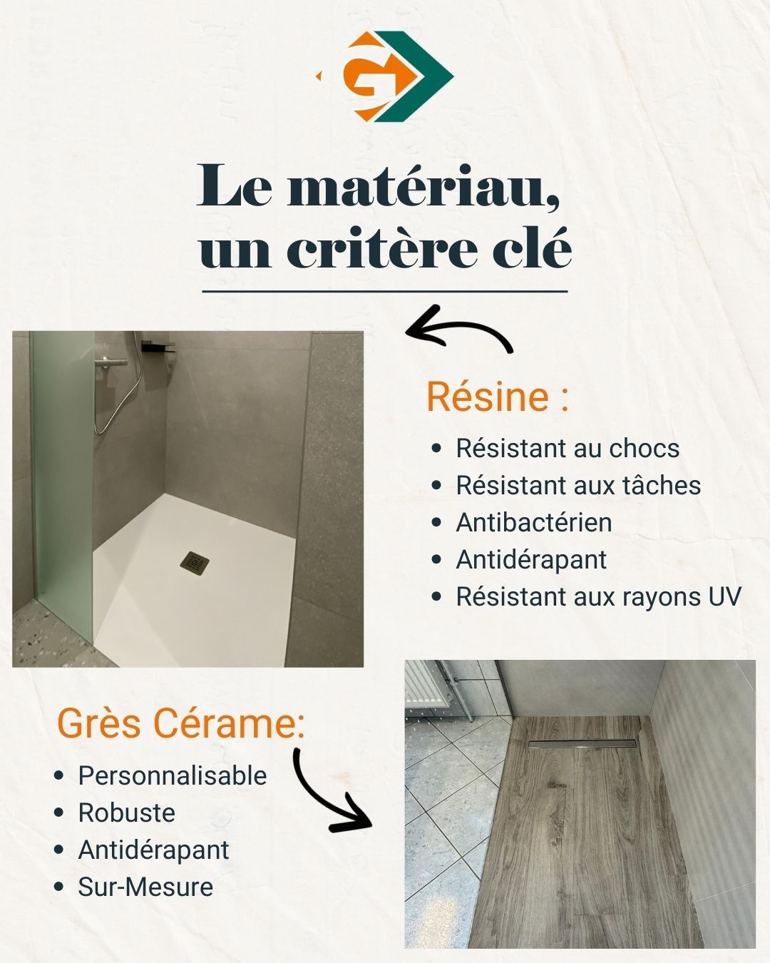 Résistante aux chocs et aux taches, antidérapante et antibactérienne, la résine est idéale pour une douche moderne et durable.