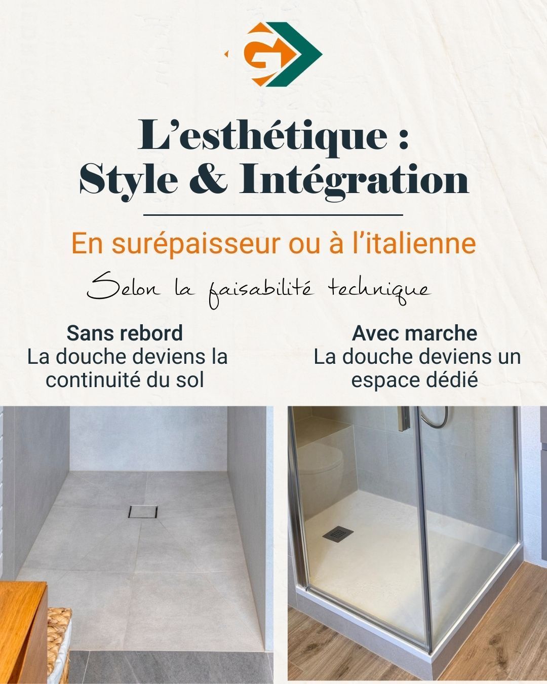 Selon la faisabilité technique, la douche peut être :