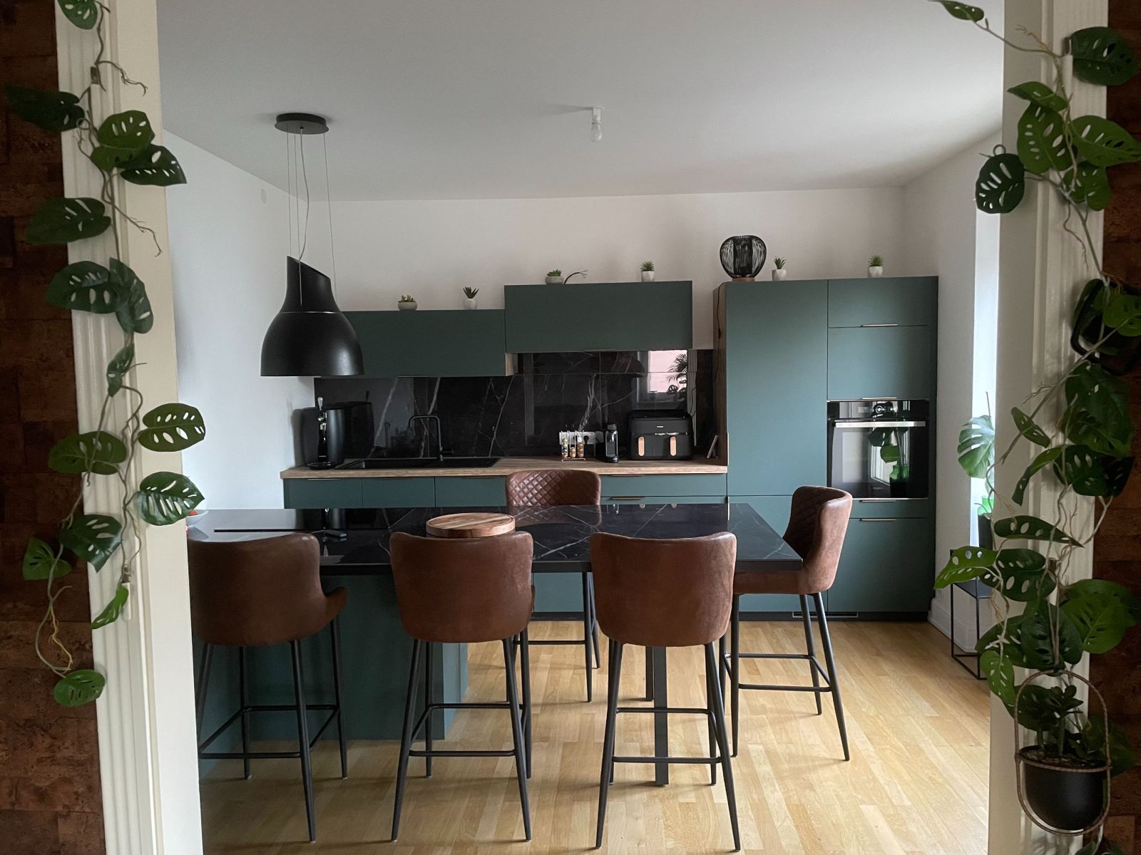 Le contraste entre les éléments sombres et les meubles vert sauge mats crée une ambiance raffinée, chaleureuse et actuelle. Le plan en grès cérame poli apporte à la fois résistance, facilité d’entretien et élégance intemporelle.