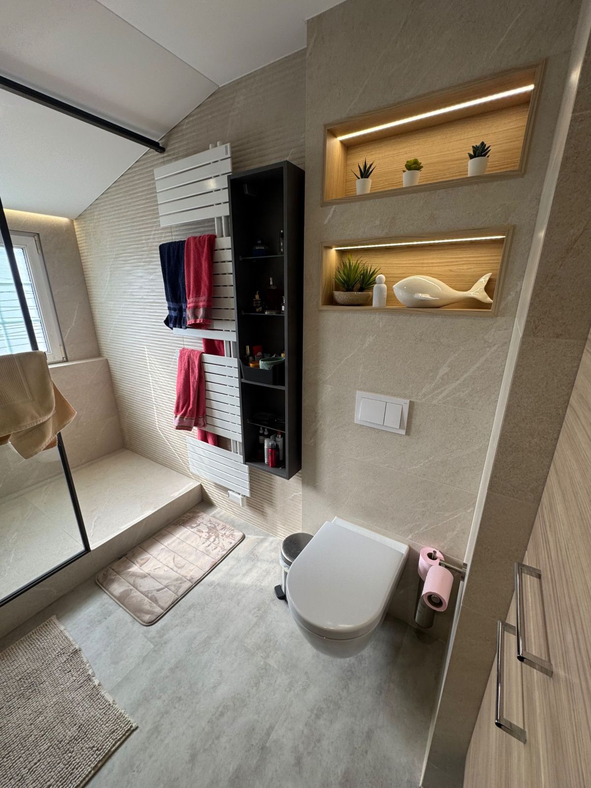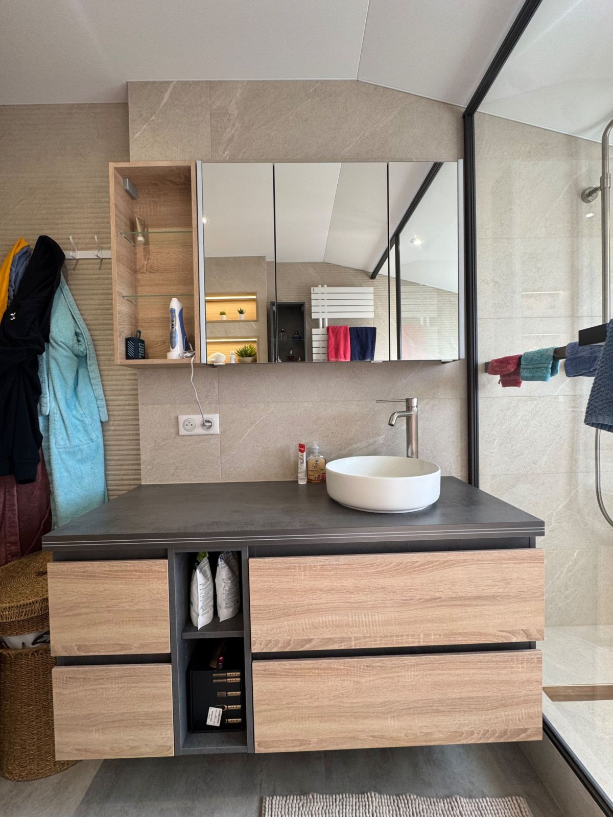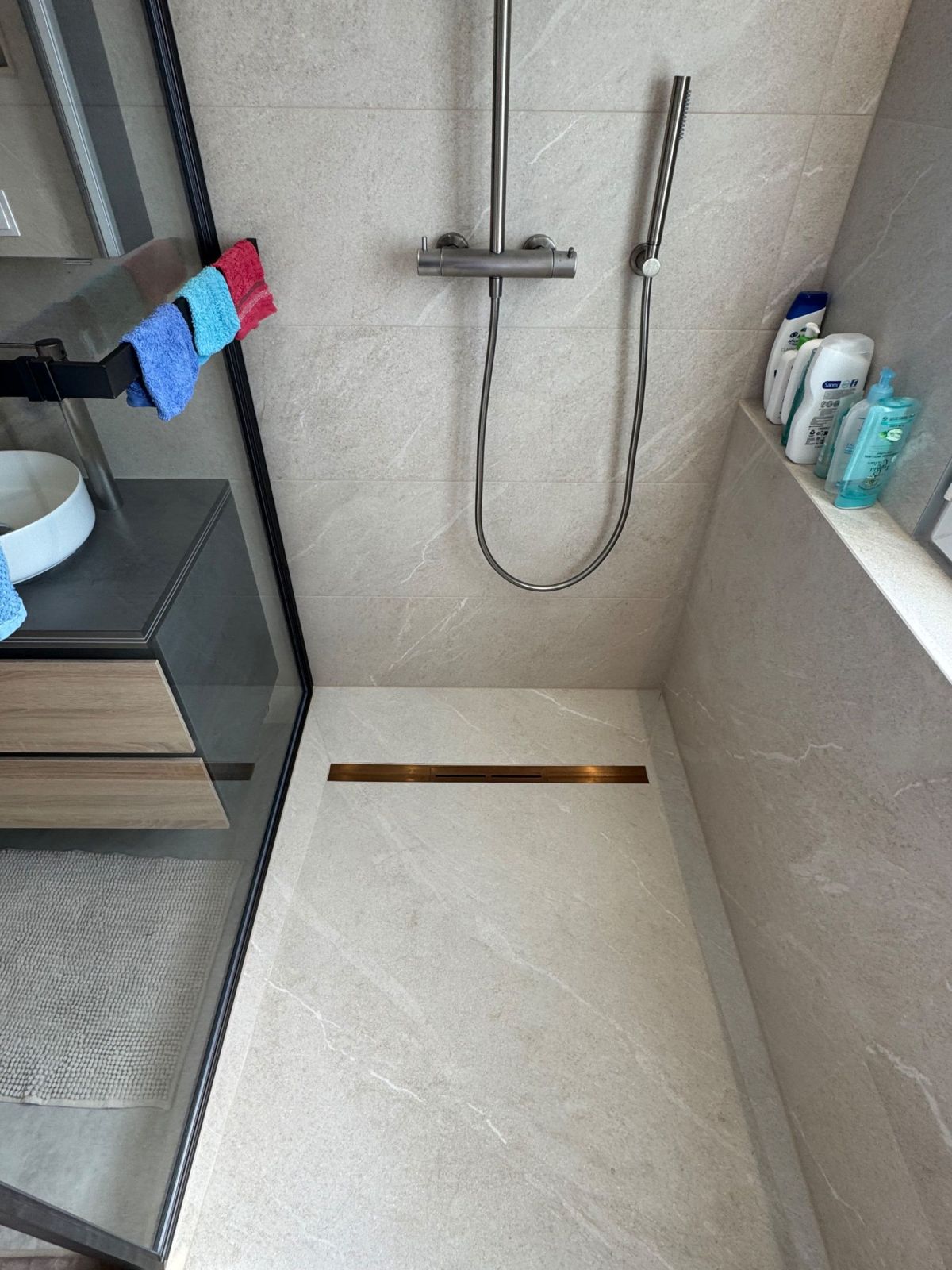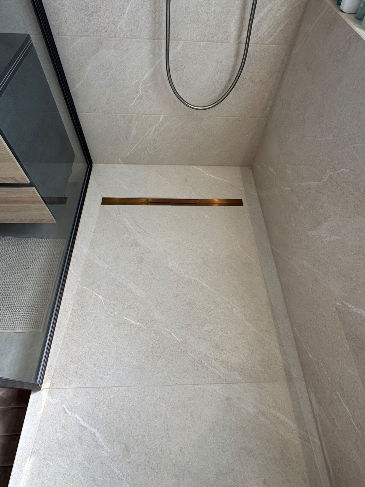 Rénovation complète de salle de bain moderne avec douche à l’italienne et matériaux grand format