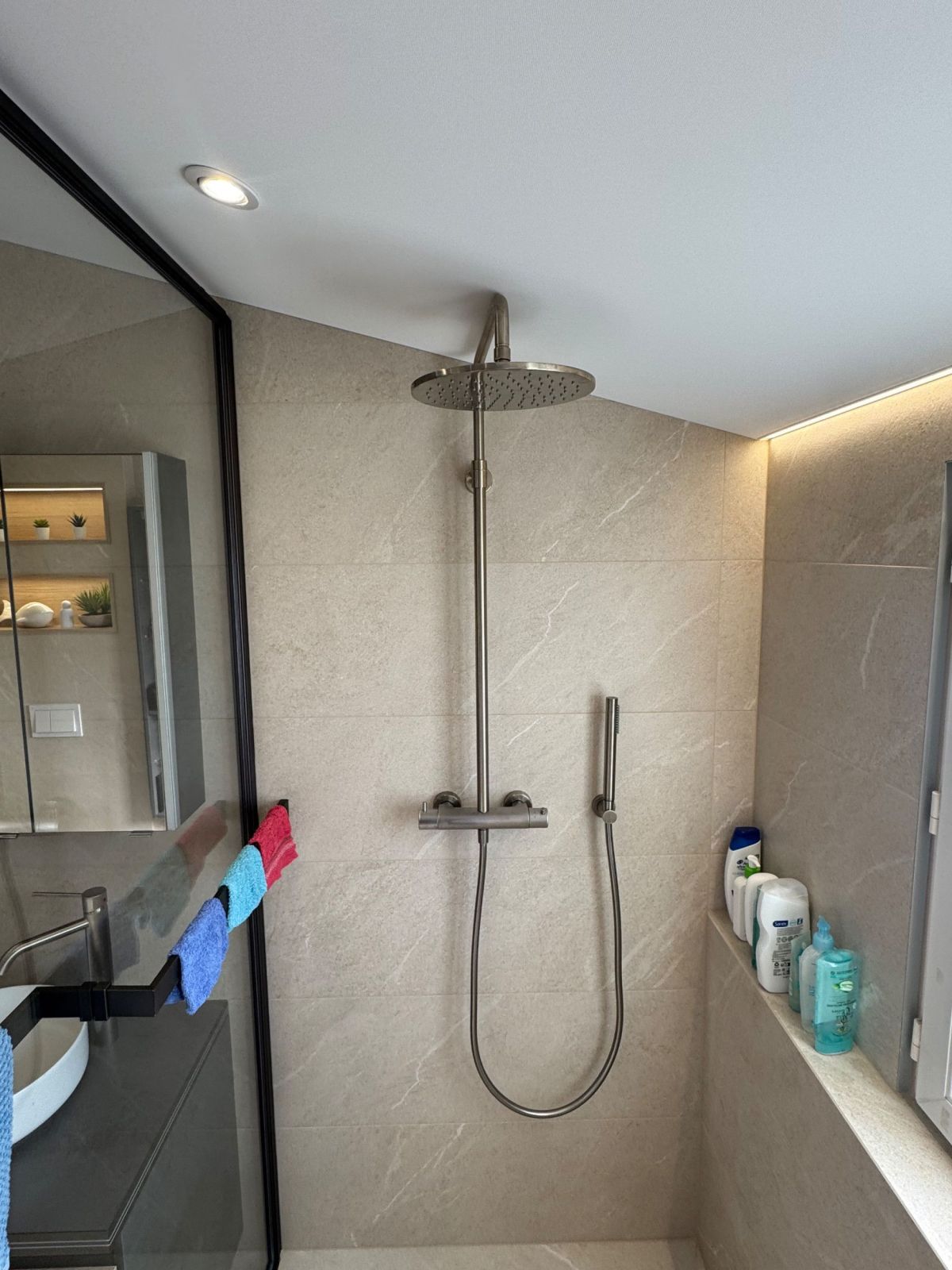 Véritable pièce maîtresse du projet, la douche a été conçue pour allier esthétique et confort :
