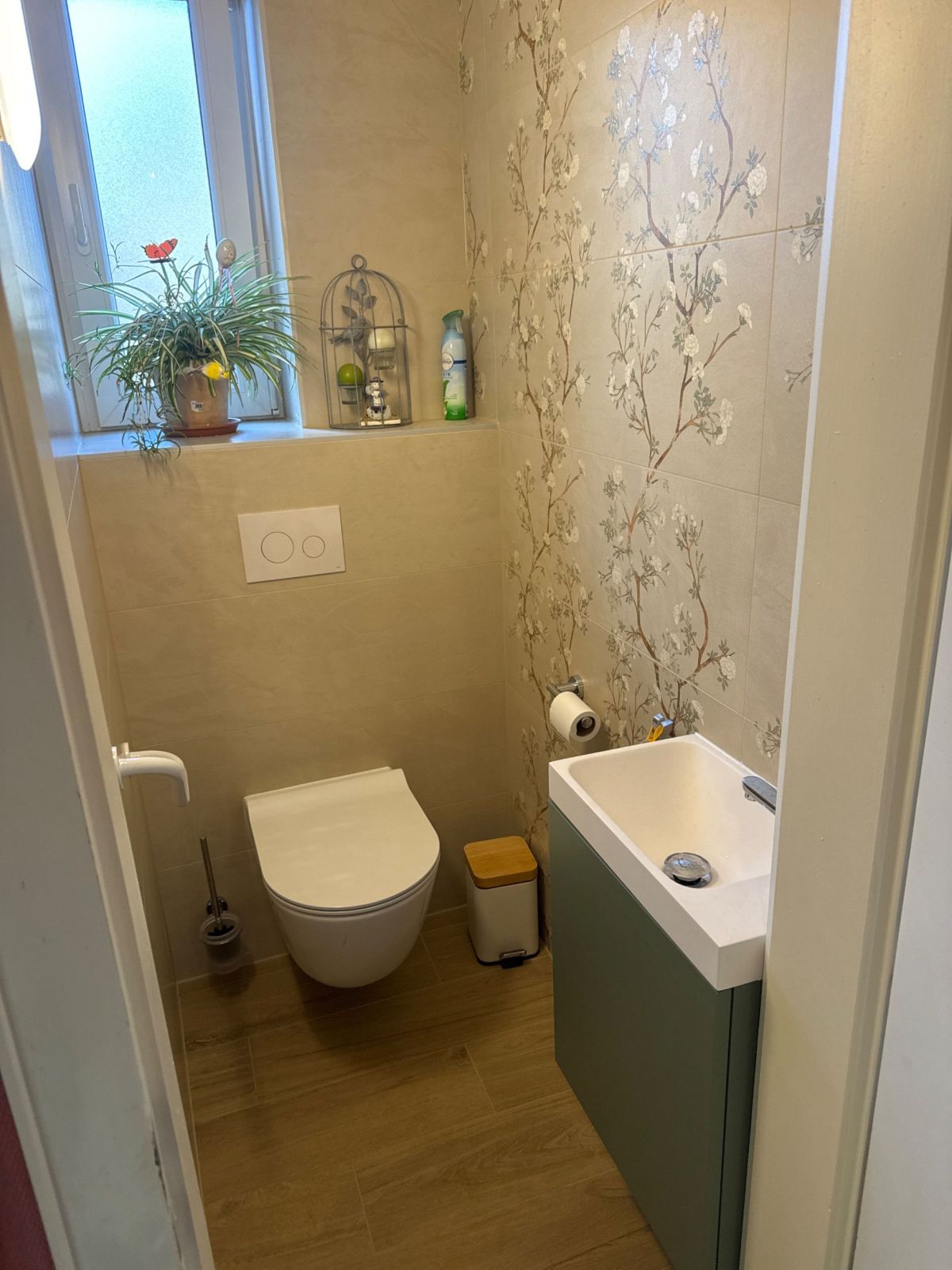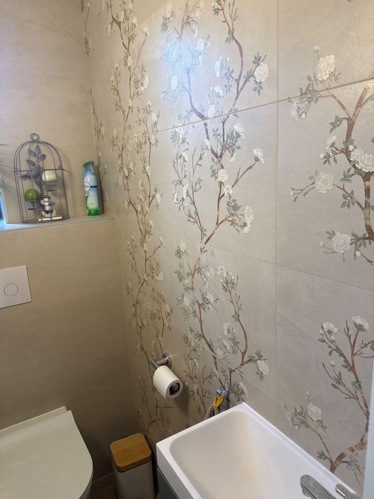 Côté murs, la structure a été reprise avec la pose de BA13 hydrofuge, suivie de l’intégration d’un bâti-support encastré pour un rendu épuré. L’ensemble est habillé d’une faïence élégante de la collection ENYA de Colorker. Le décor floral délicat Almond Nude (format 31,6x100) apporte douceur et raffinement.