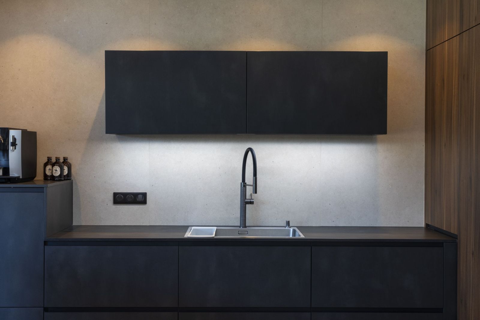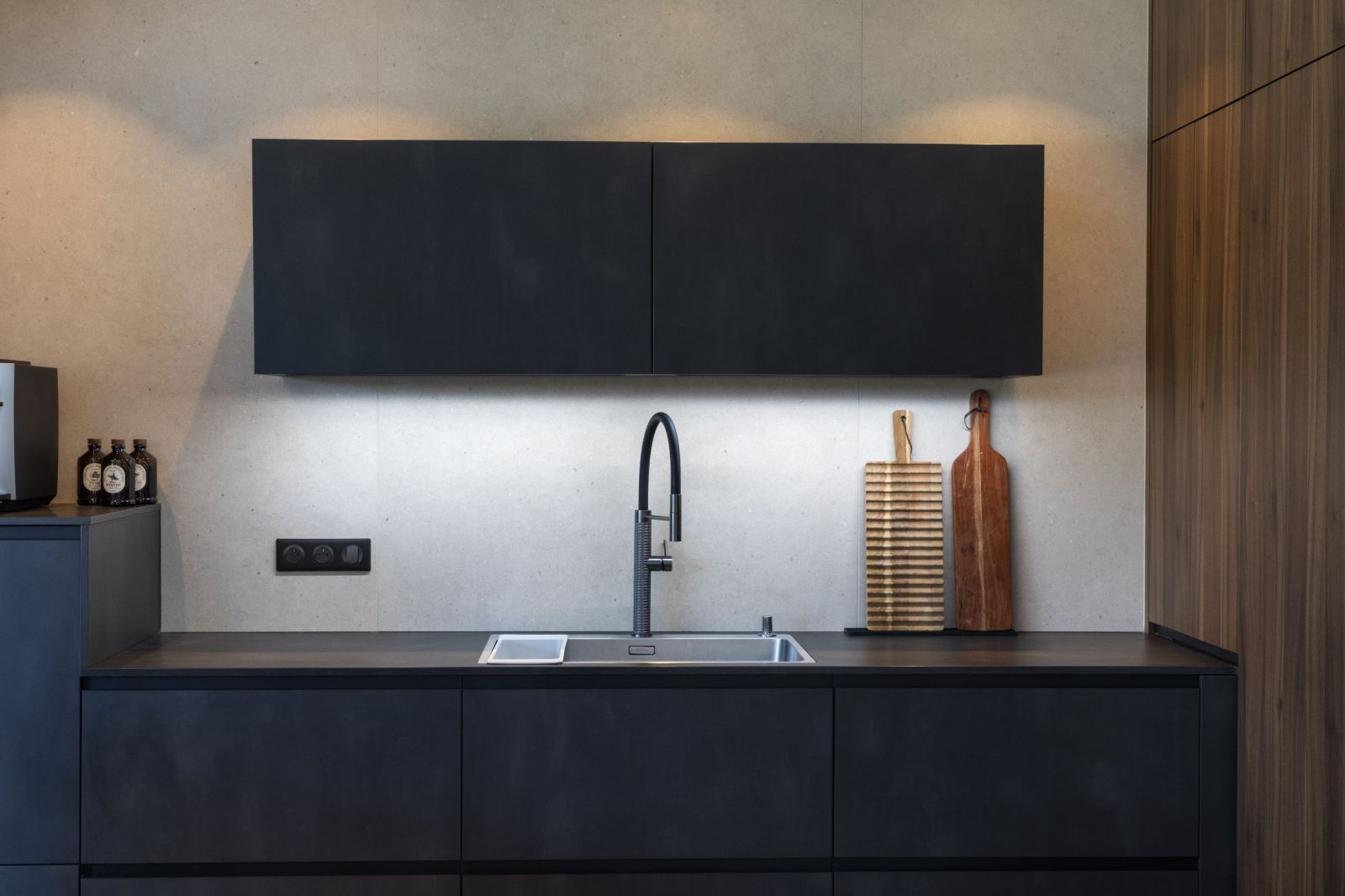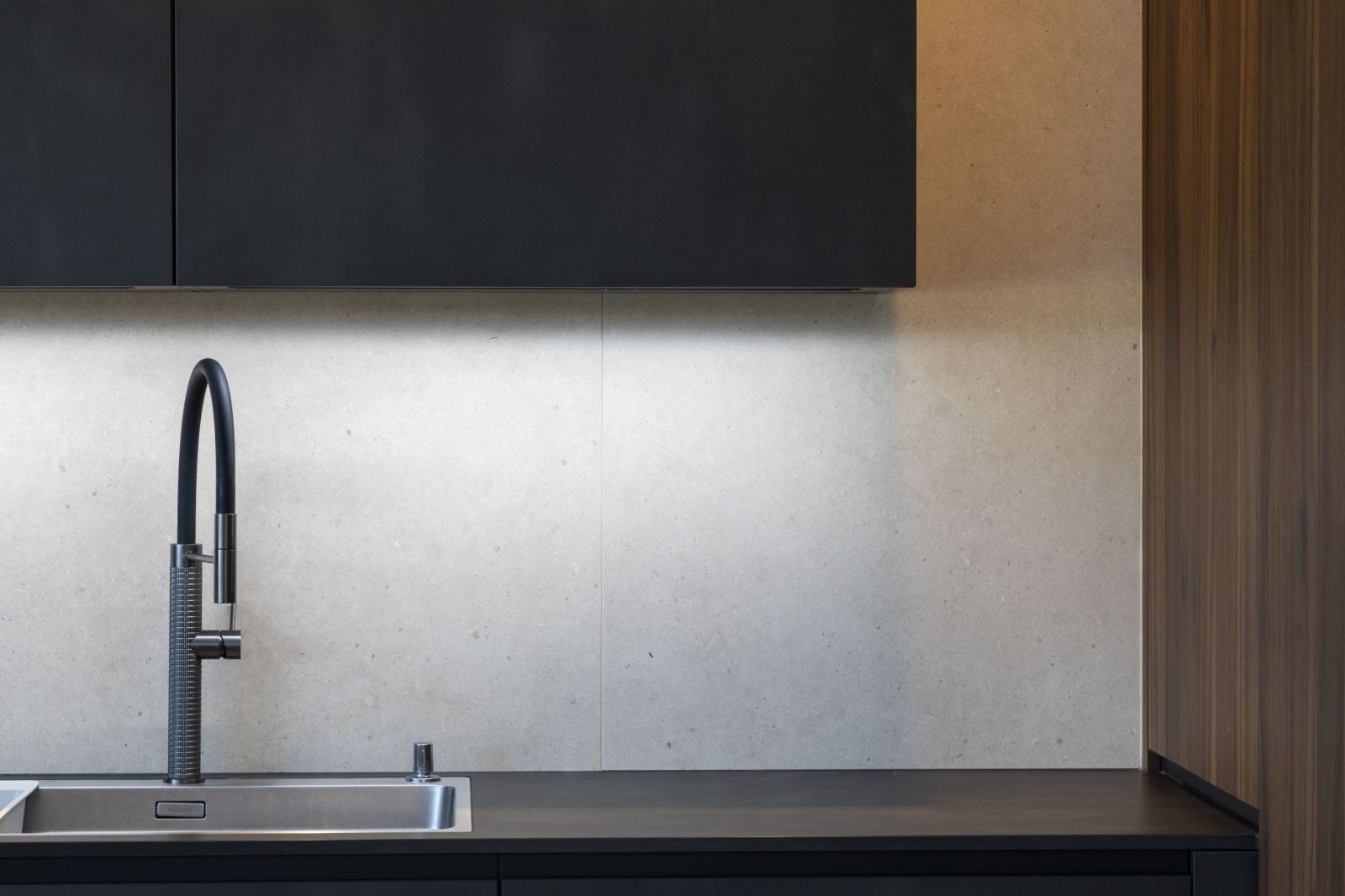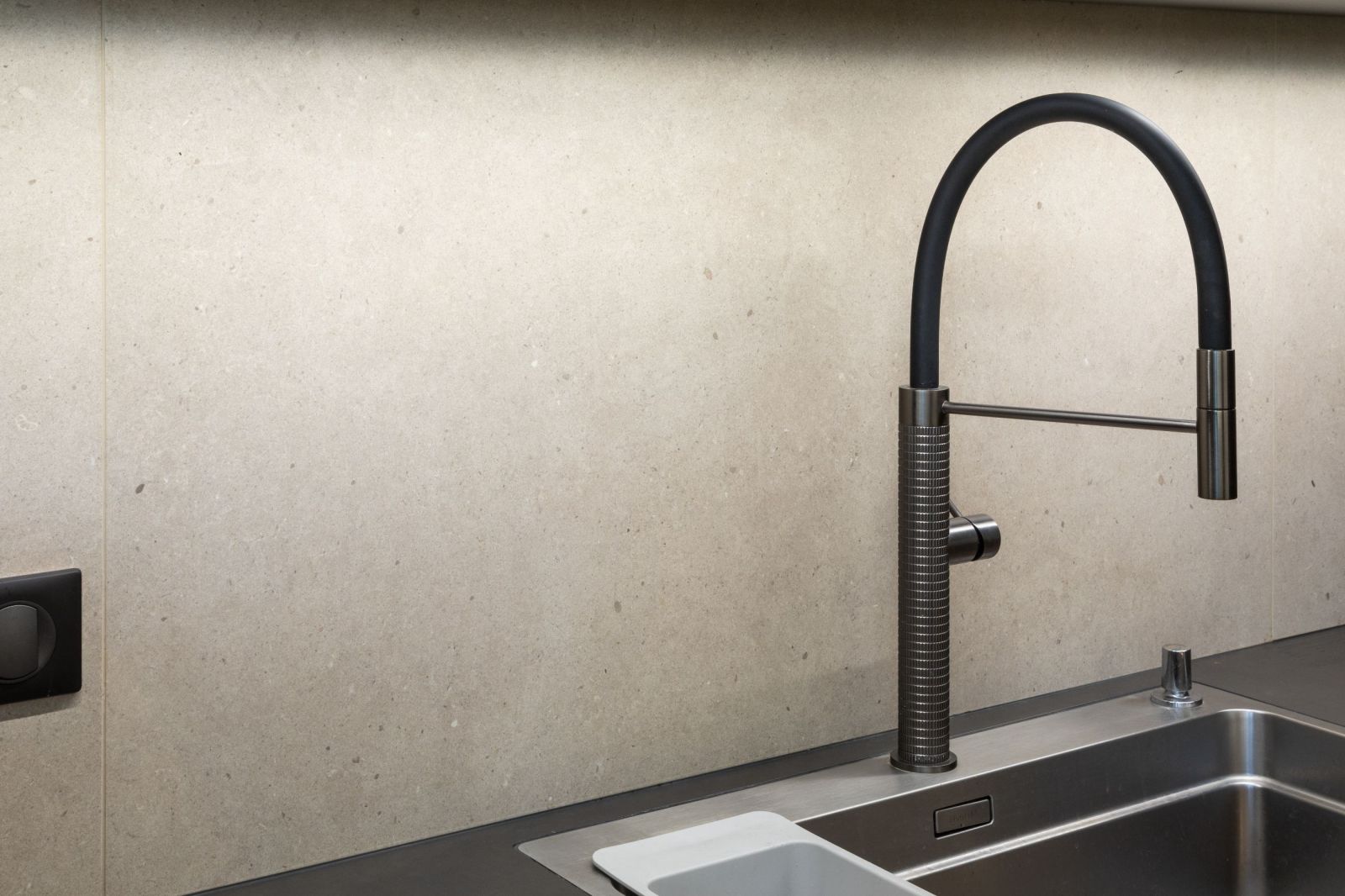 - la crédence qui a été pensée comme un véritable élément d’architecture intérieure avec la pose de plaques XXL en grès cérame au mur (120x278 cm) de la COLLECTION ELYSIAN. Son aspect pierre naturelle claire crée un fond texturé subtil, qui rehausse le design sans surcharger l’ensemble de la cuisine.