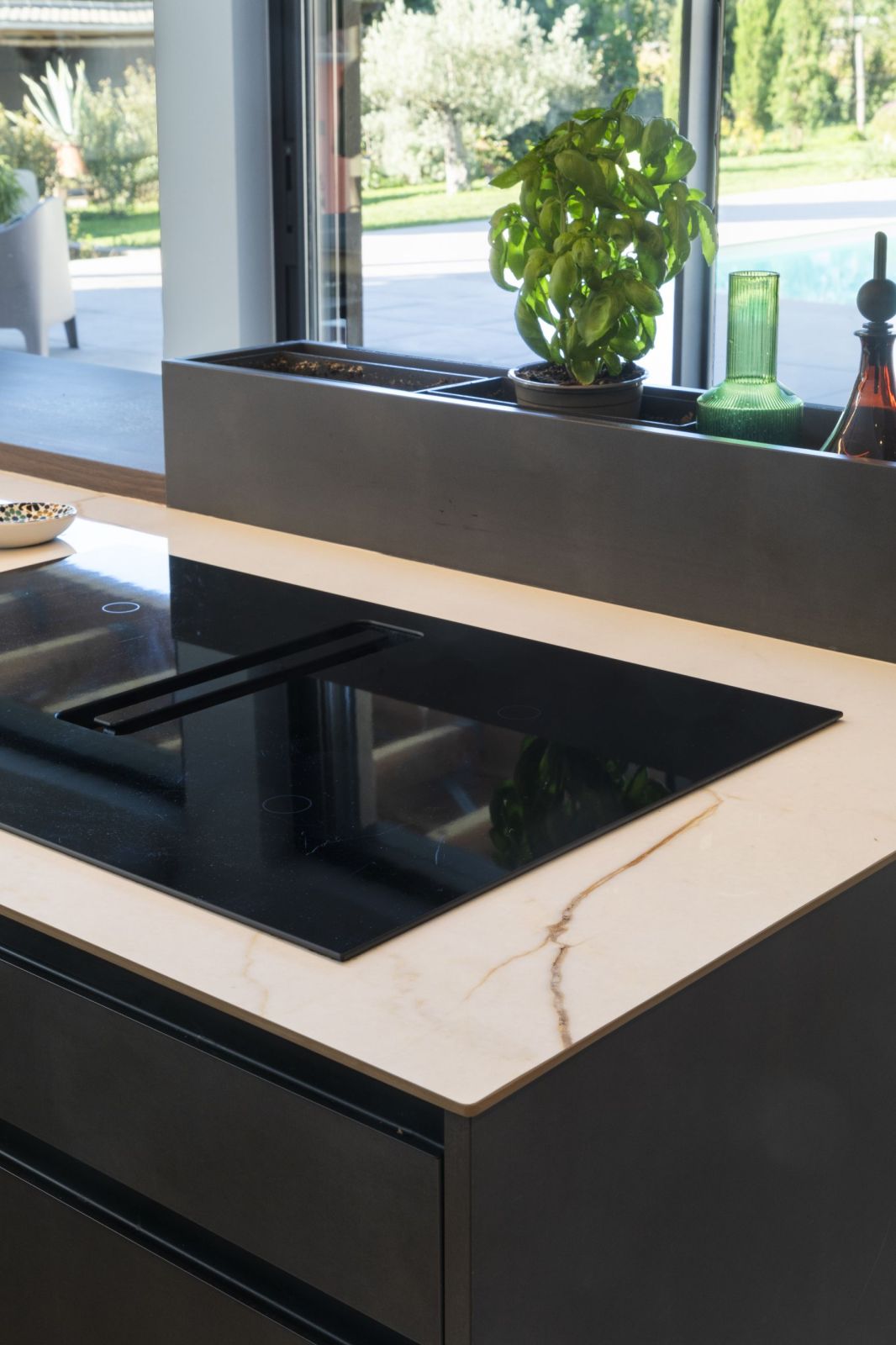 - le plan de travail réalisé en grandes plaques de grès cérame 120x260 de la COLLECTION SUNSHINE. Le grès cérame assure une facilité de nettoyage, d'entretien pour un espace hygiénique.
