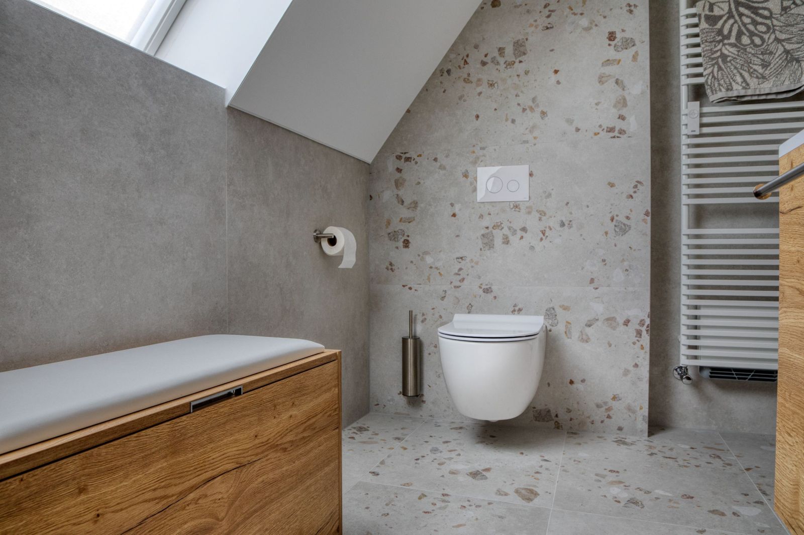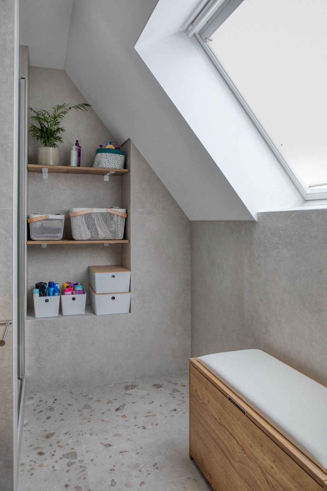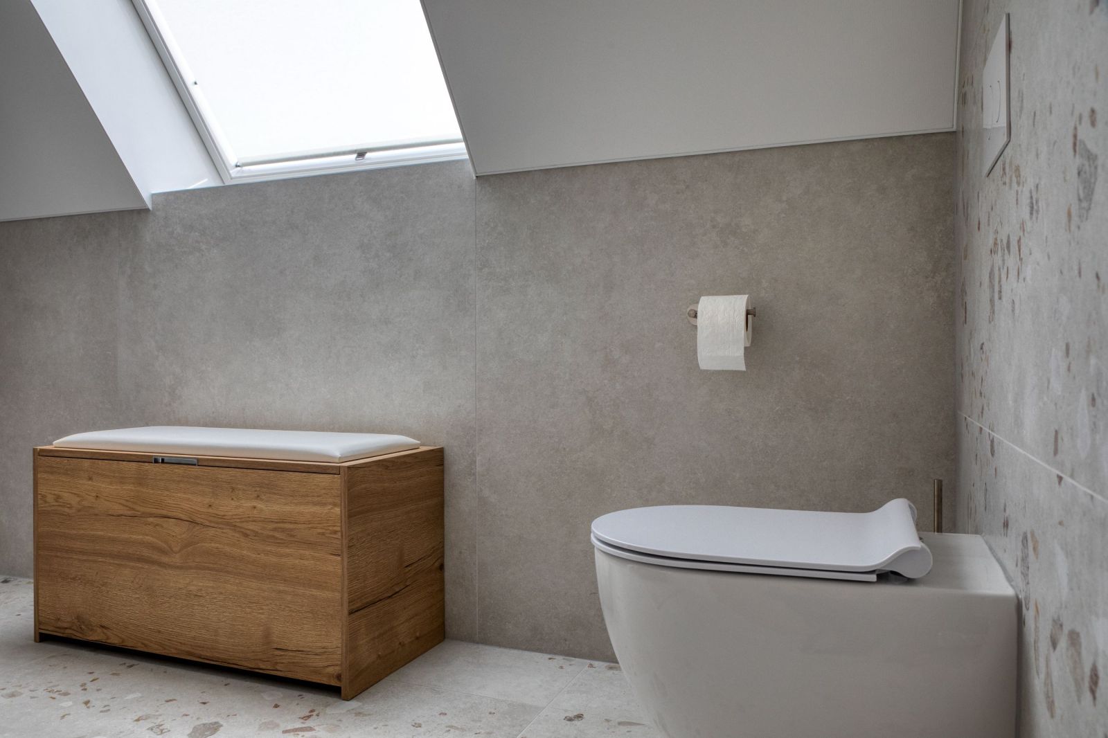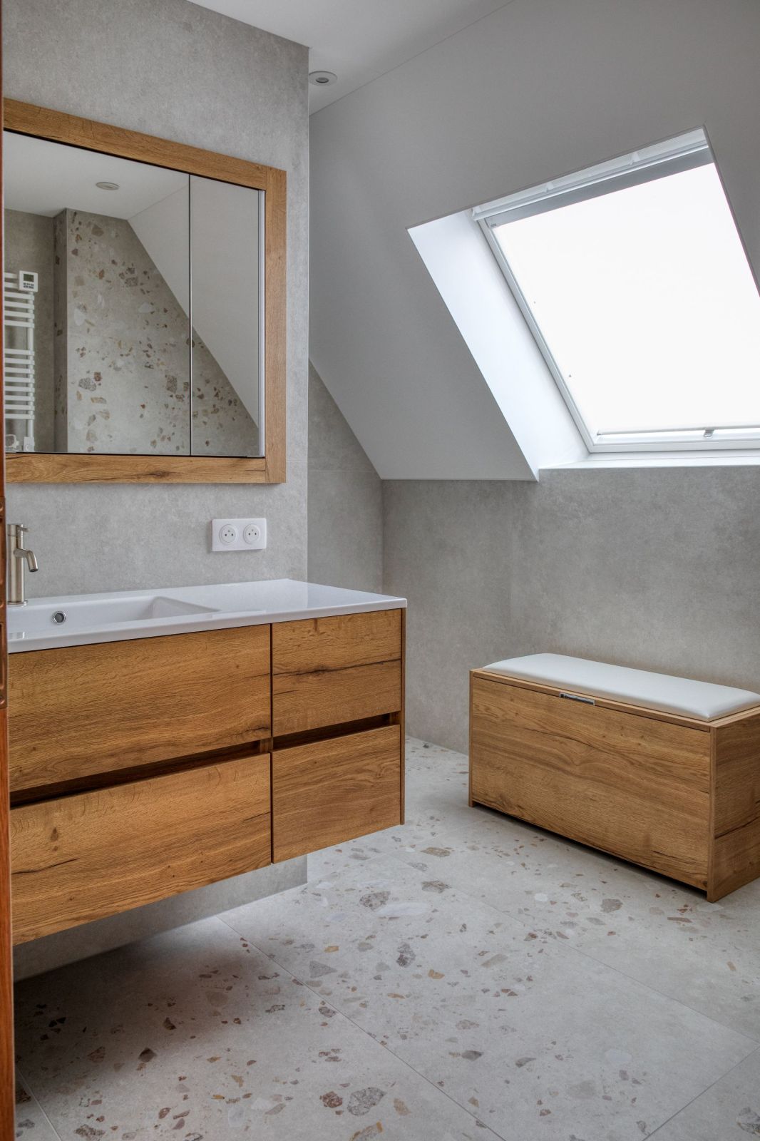 Cette pièce a été transformée en un lieu de détente lumineux, où le mélange bois minéral & terrazzo moderne crée une ambiance douce et structurée. Le mobilier suspendu et les rangements intégrés libèrent l’espace au sol pour une circulation fluide.