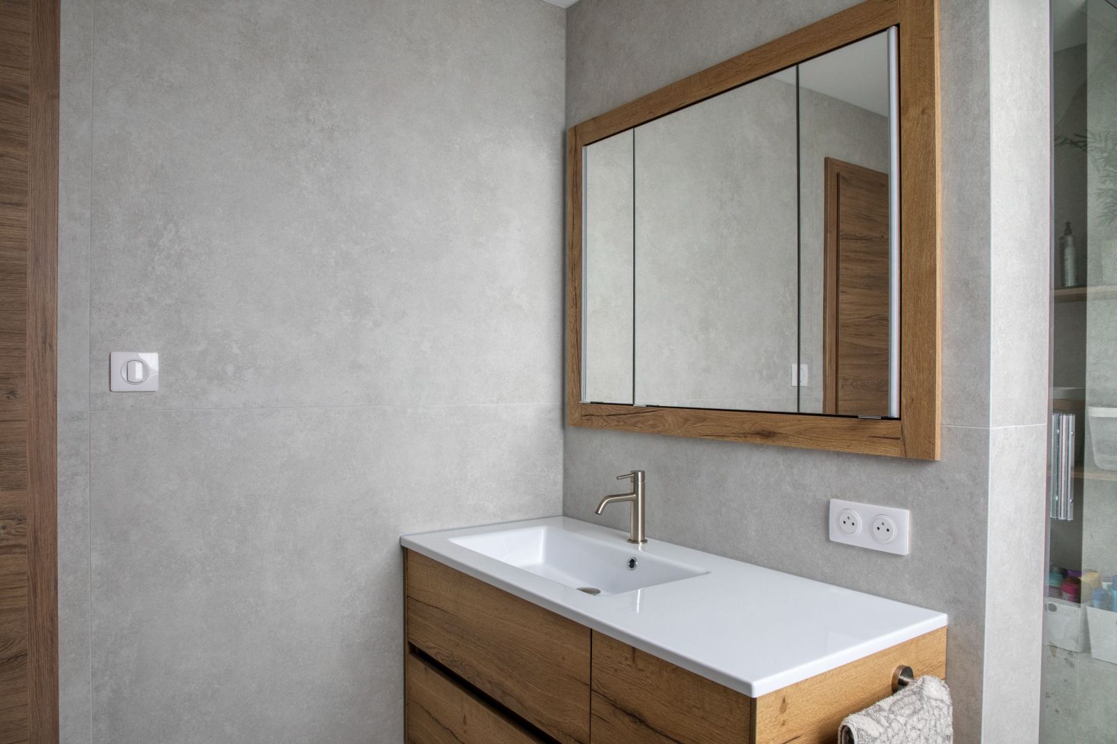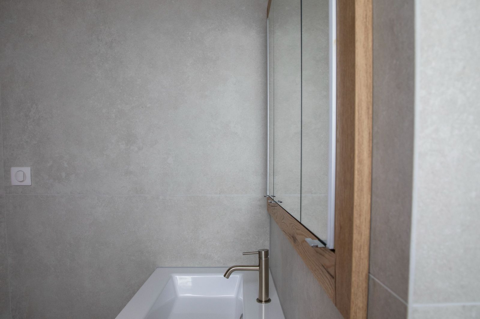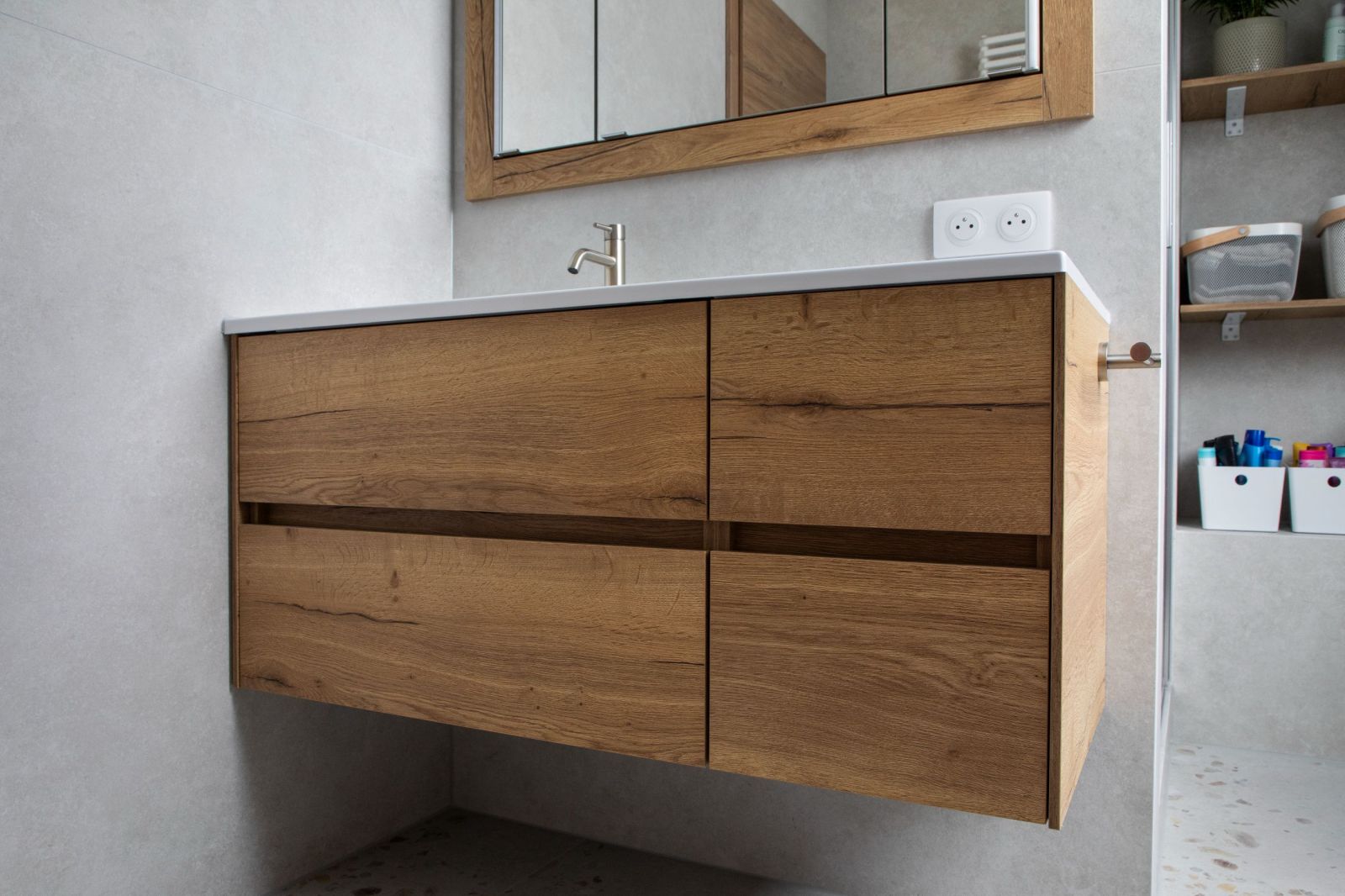 GERBER, spécialiste Carrelage, Salle de Bain et Terrasse, a transformé cette salle de bain en un espace à la fois moderne, chaleureux et parfaitement optimisé.Travaux réalisés :