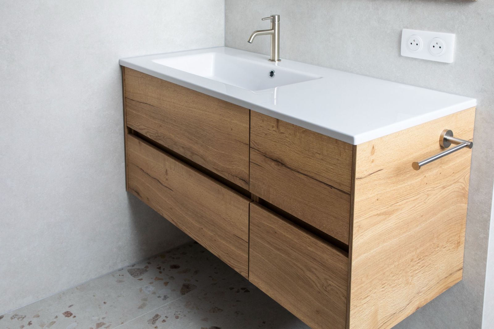 Meuble vasque suspendu, audacieux et pratique, avec plusieurs tiroirs