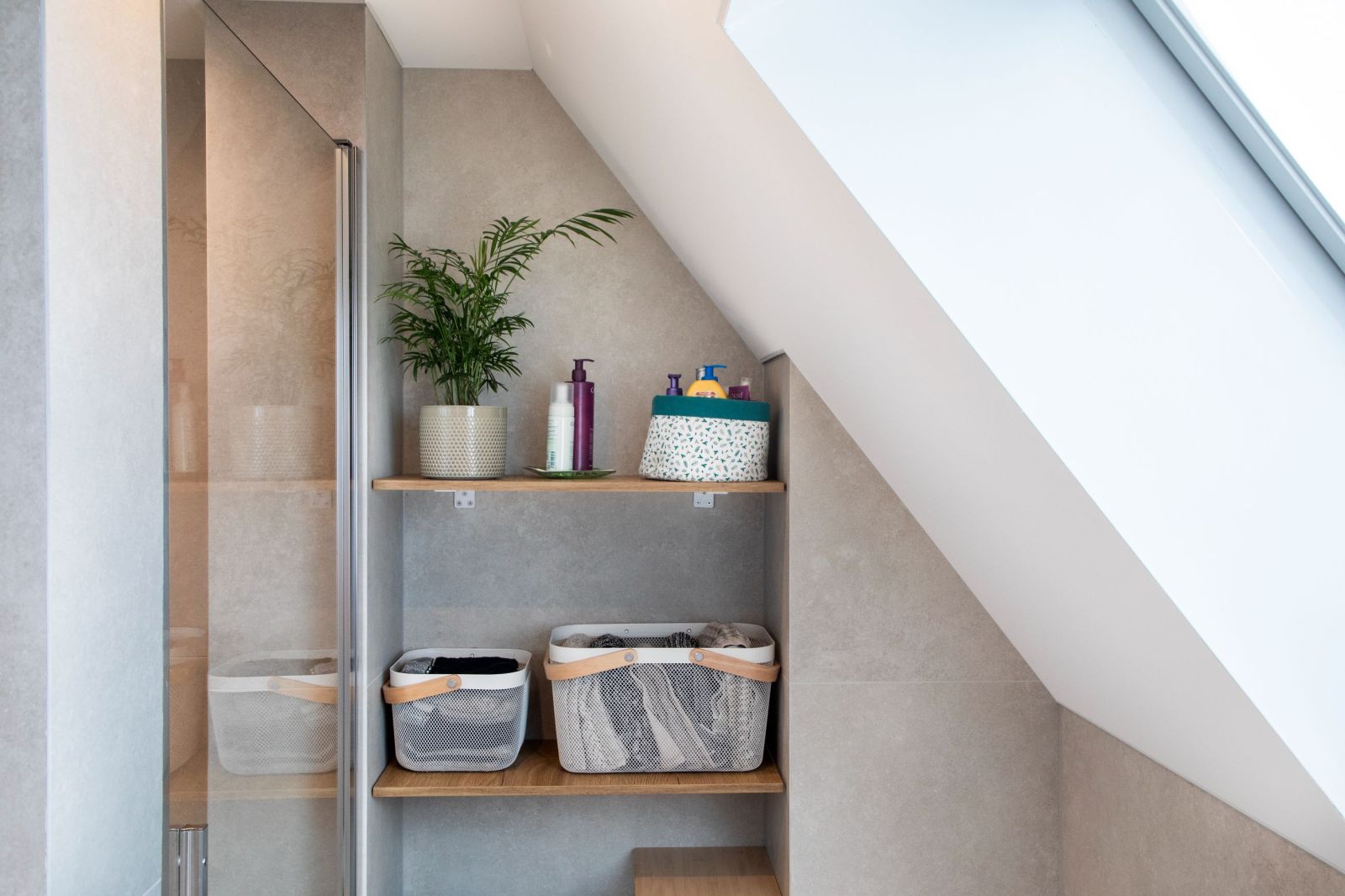 Niche de rangement intégrée avec étagères bois pour optimiser l’espace