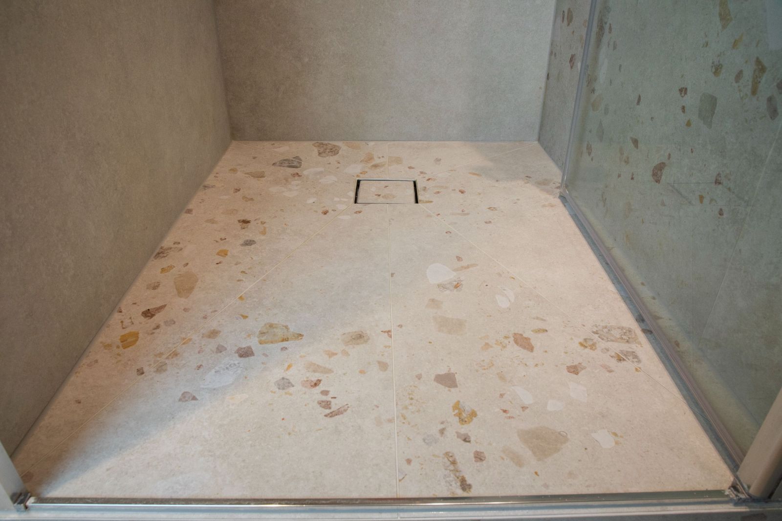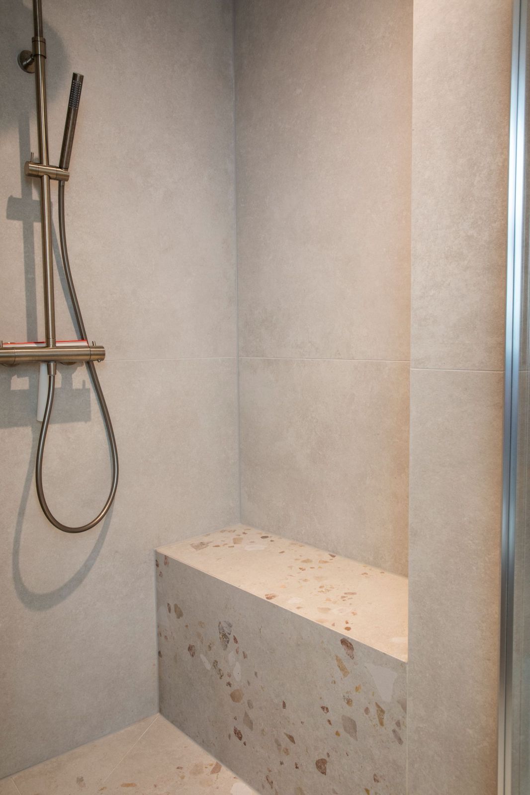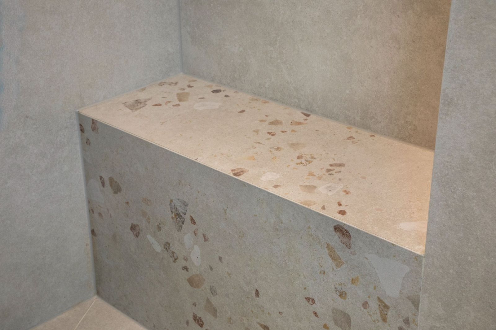 Création d’une douche avec banquette intégrée et paroi vitrée battante