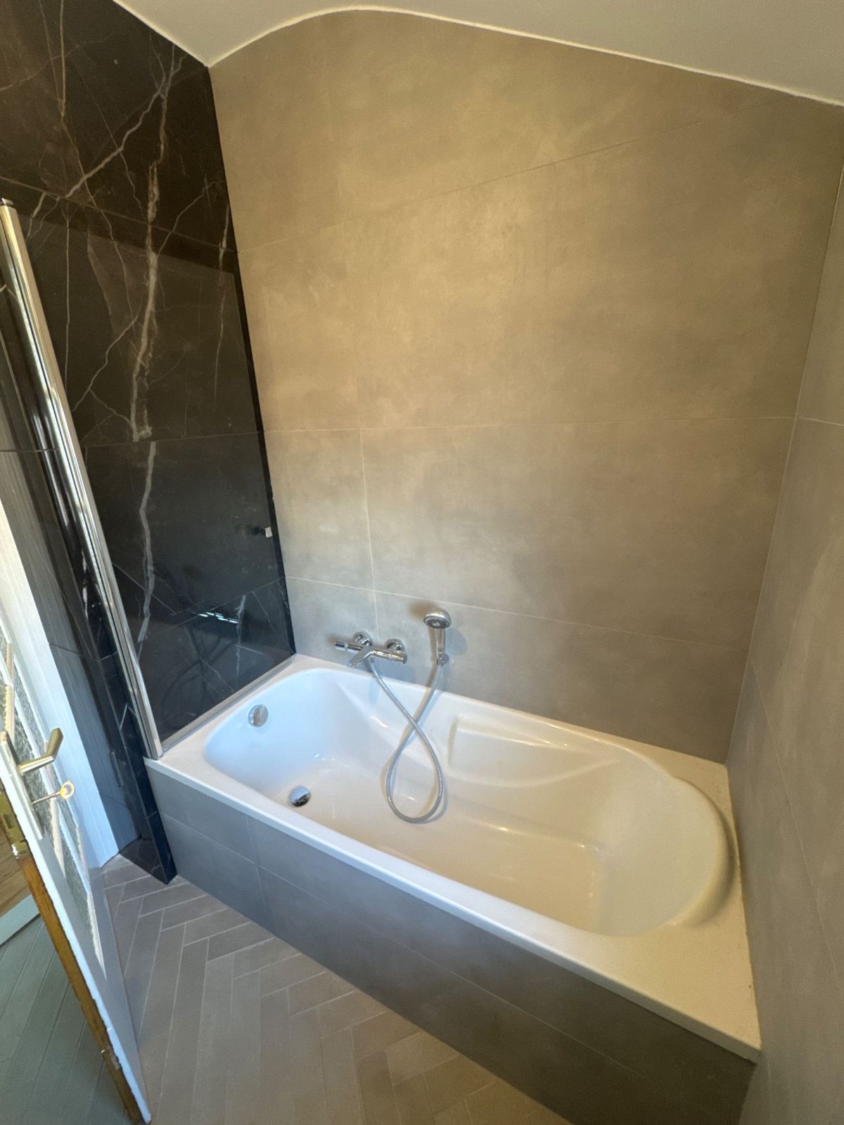 Habillage mural raffiné : pose de carreaux grand format 60x120 avec un contraste subtil entre le marbre noir effet “Black Diamond” de la collection Scultorea et le ton uni perla de la collection Multiforme, pour une ambiance contemporaine et élégante.