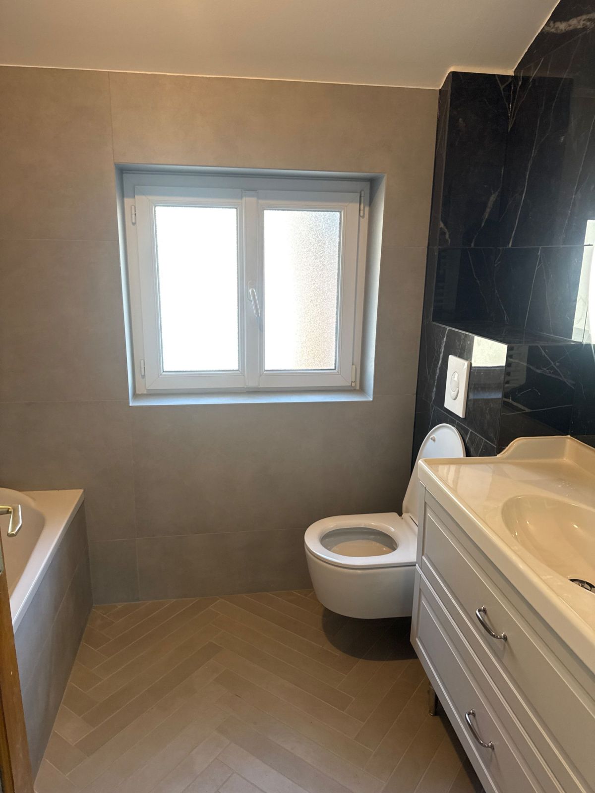 Transformer sans tout changer, c’est possible ! Pour cette rénovation de salle de bain, notre objectif était clair : moderniser la pièce tout en conservant les éléments clés déjà en place — la baignoire, le meuble vasque et le WC suspendu.