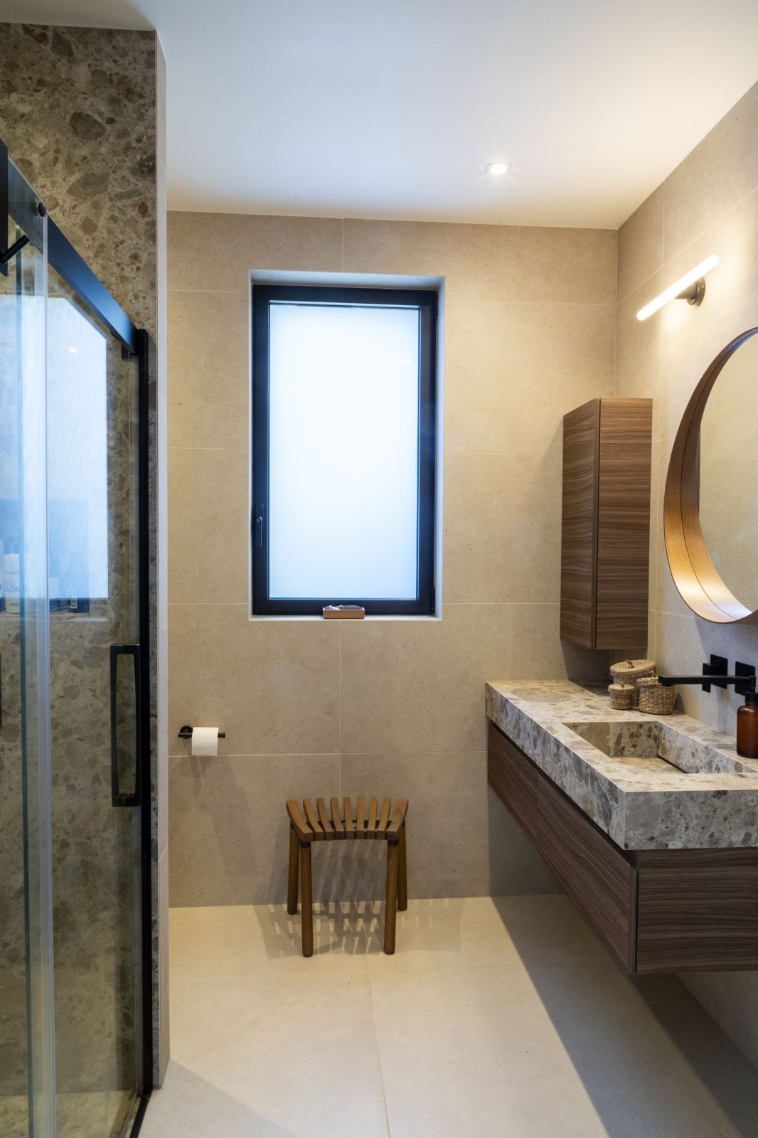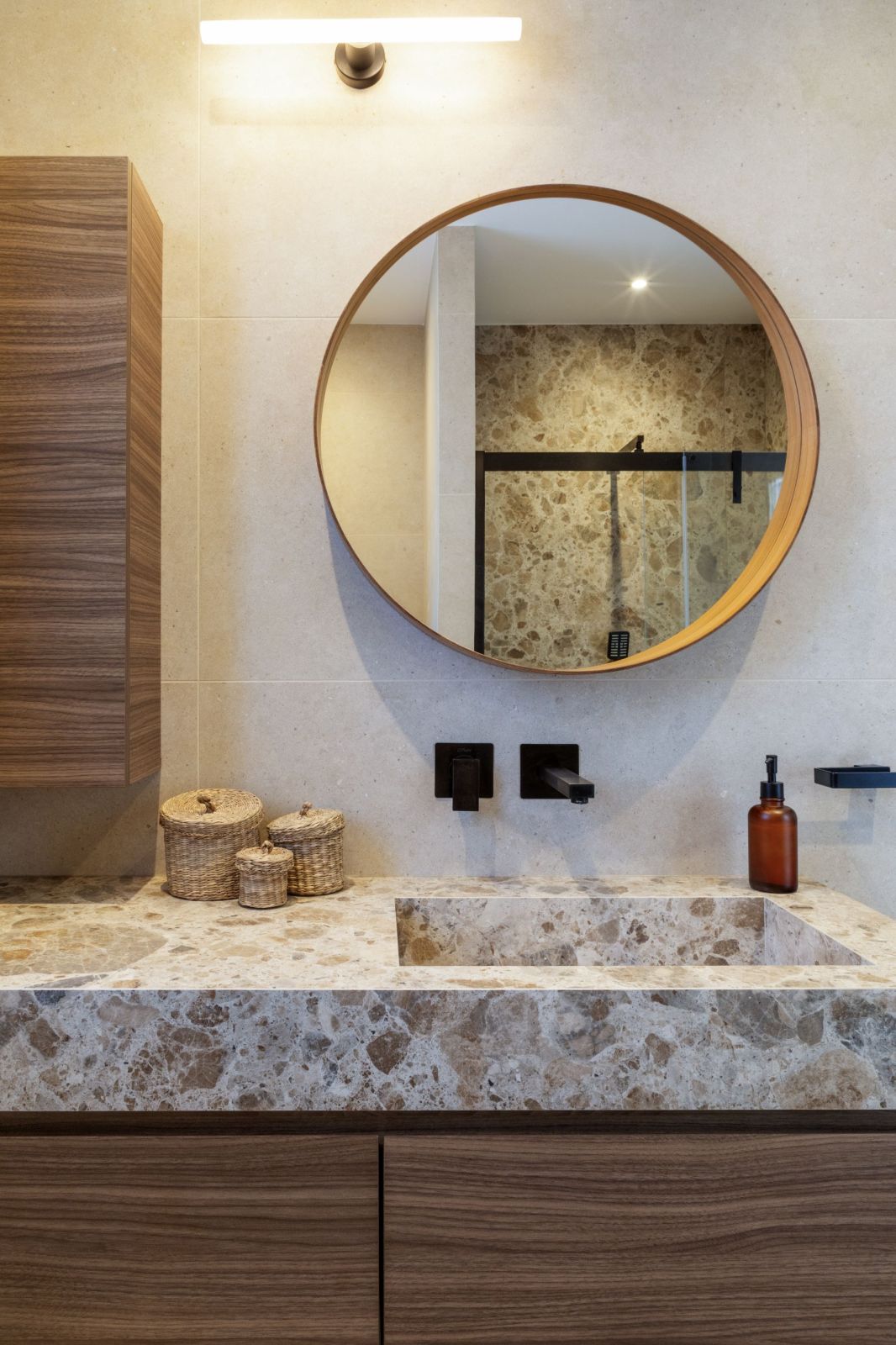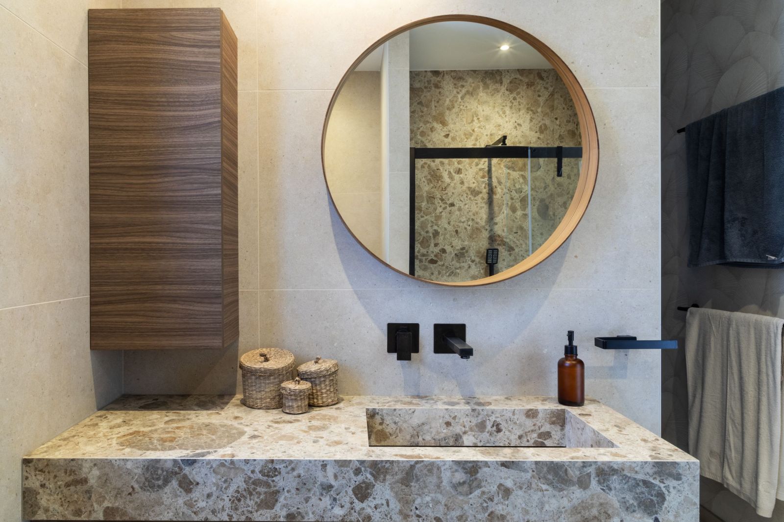 Ambiance minérale et chaleureuse, soulignée par des teintes beige et bois, sublimée par les détails noirs pour une touche graphique.