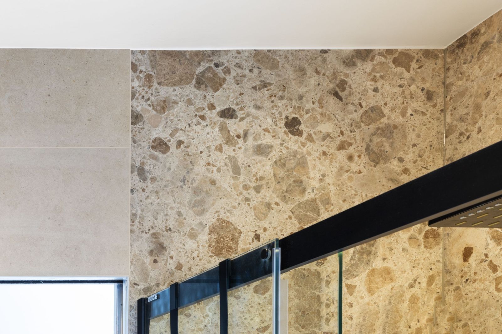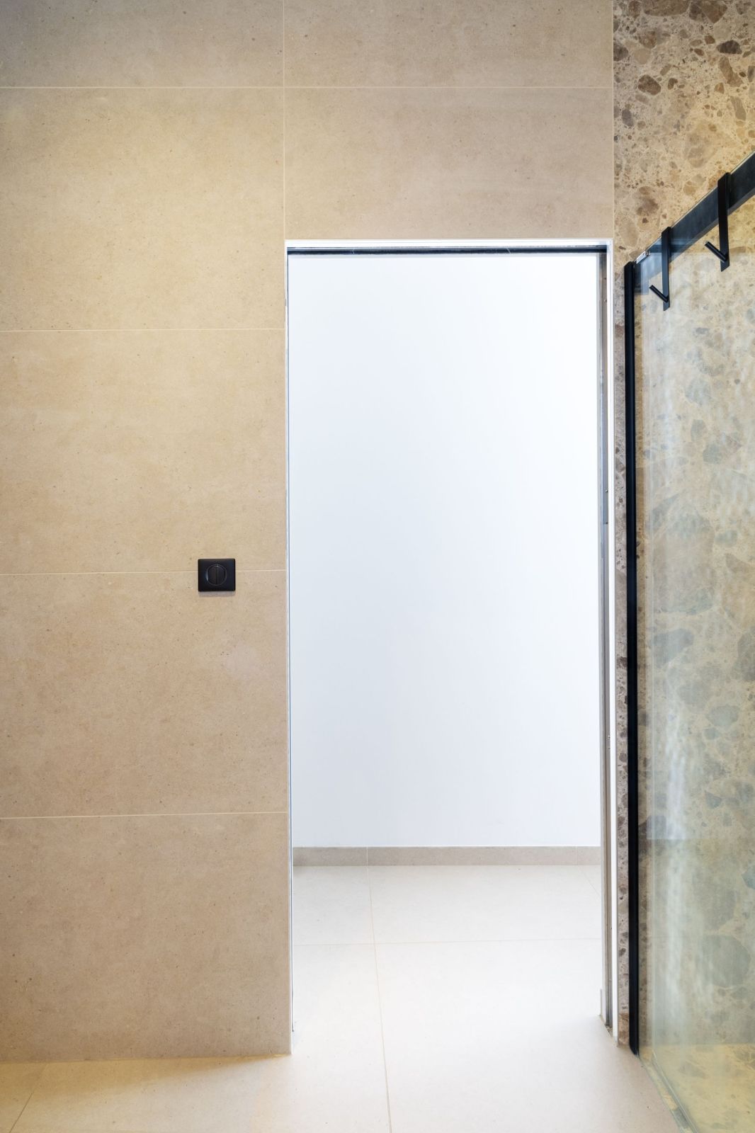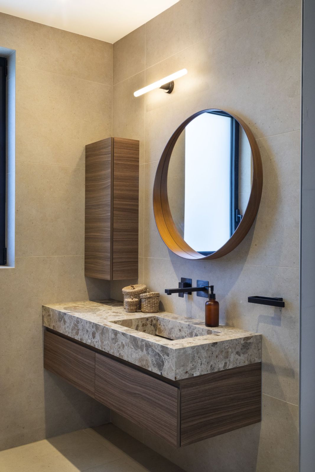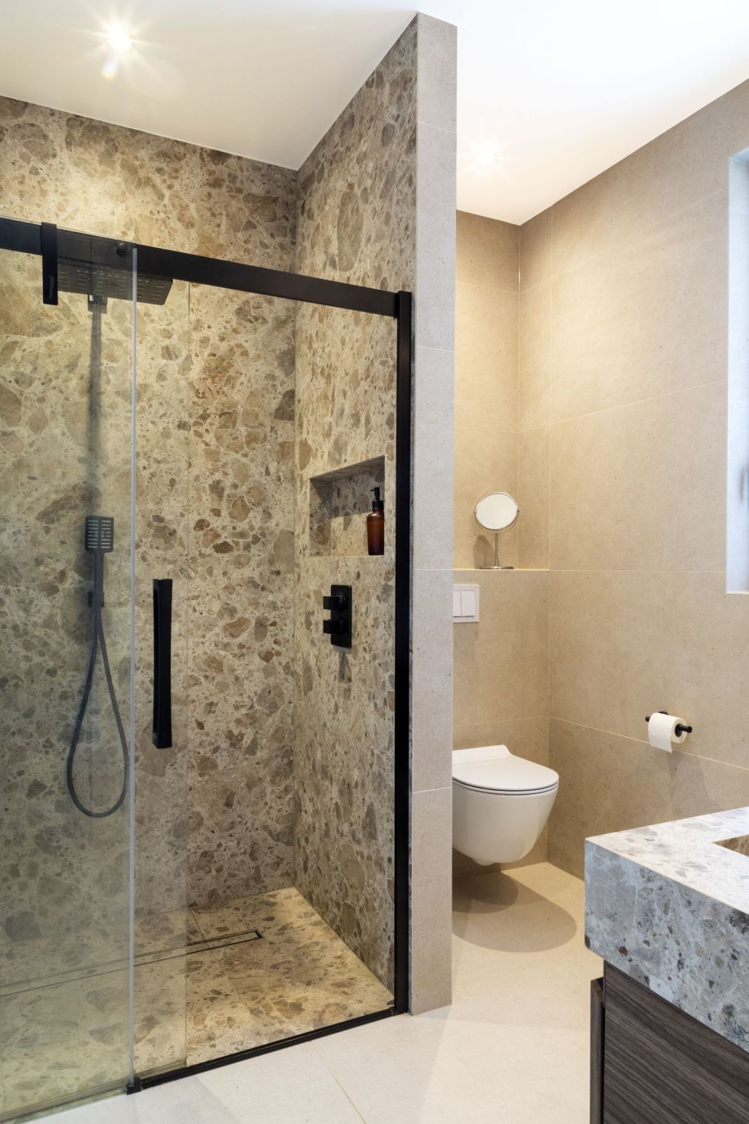 Ambiance minérale et chaleureuse, soulignée par des teintes beige et bois, sublimée par les détails noirs pour une touche graphique.