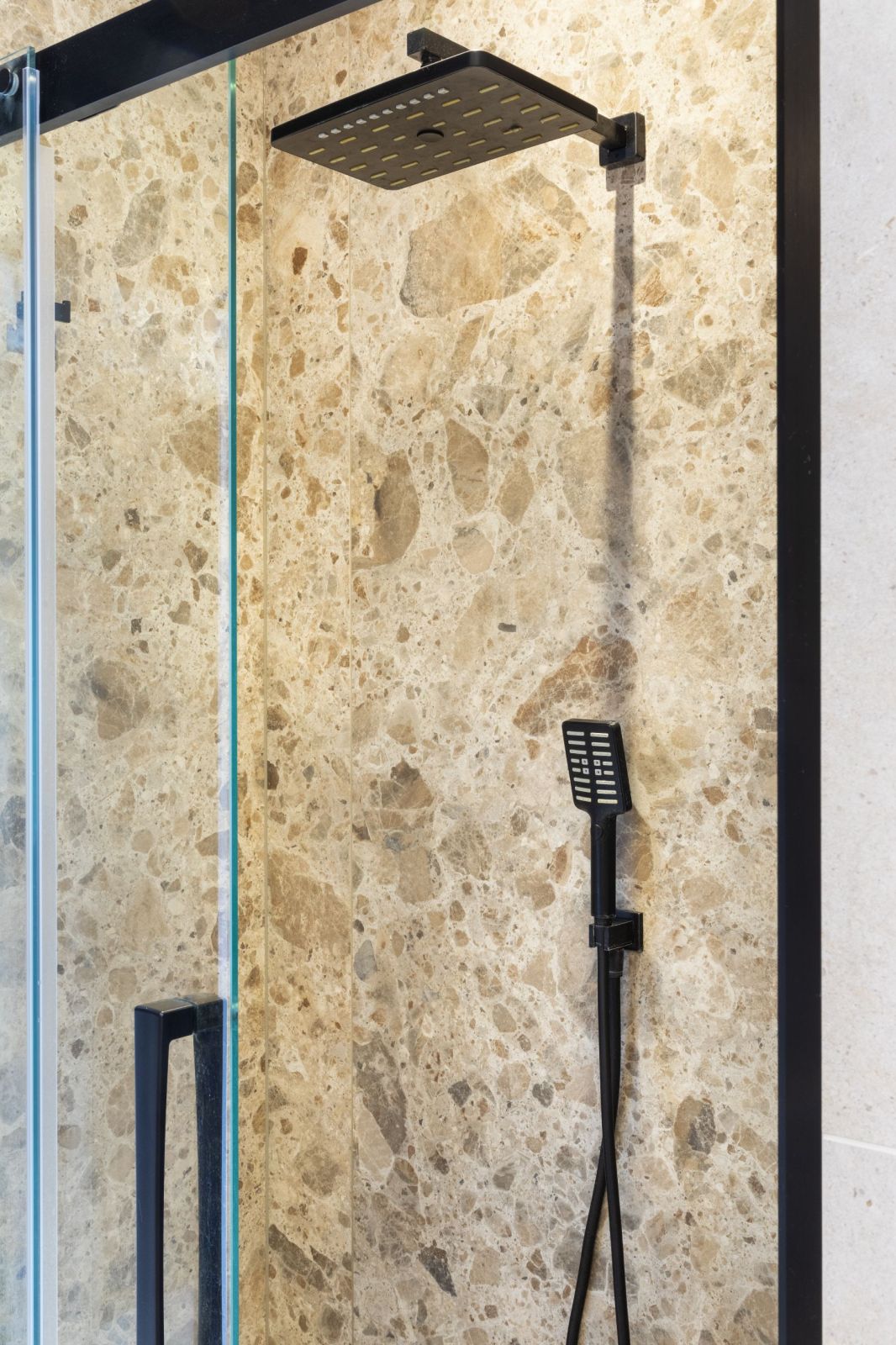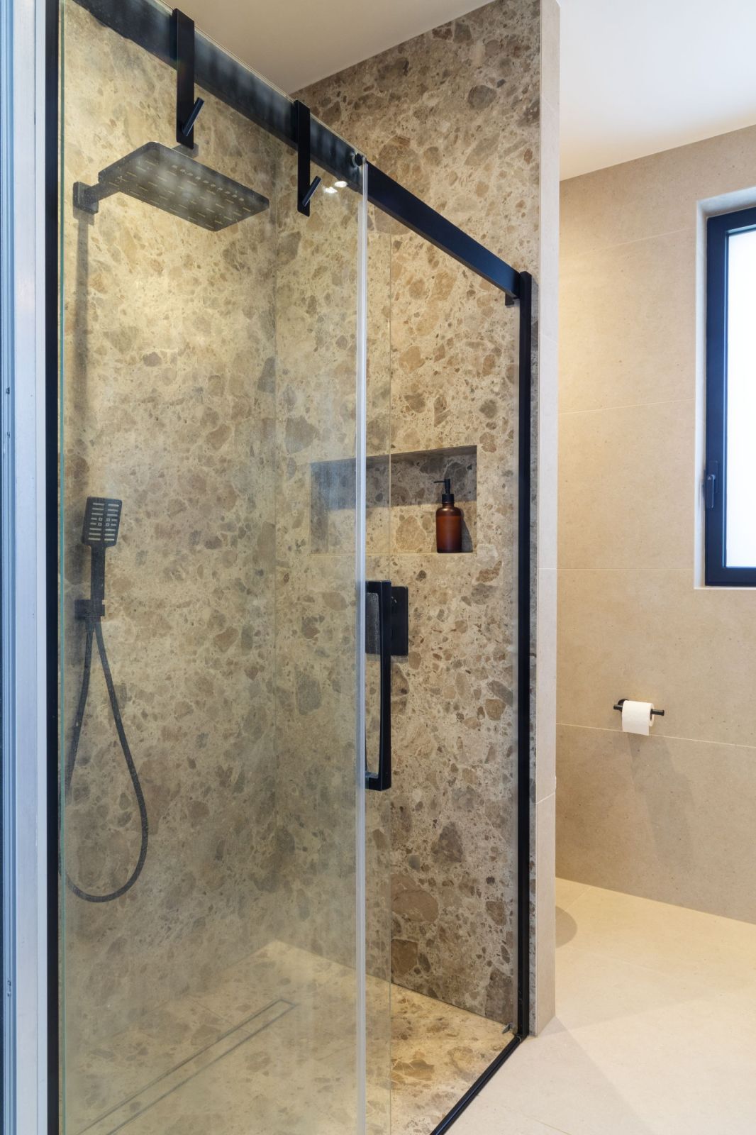 • Douche à l’italienne avec paroi vitrée et robinetterie noire mat