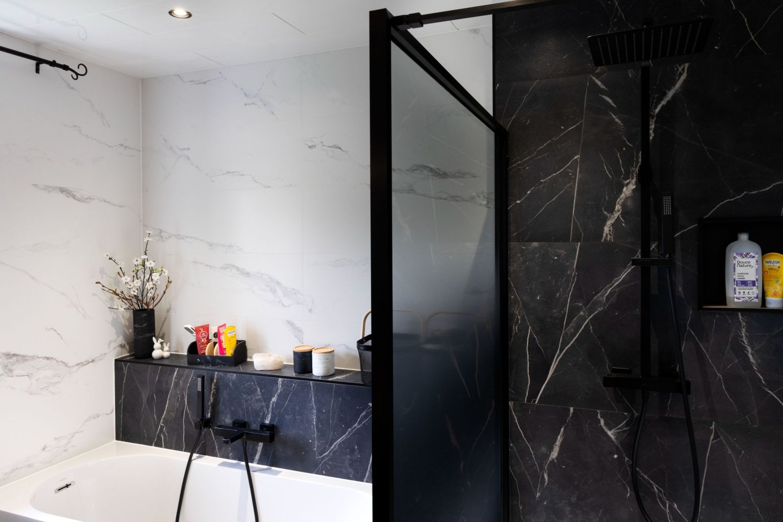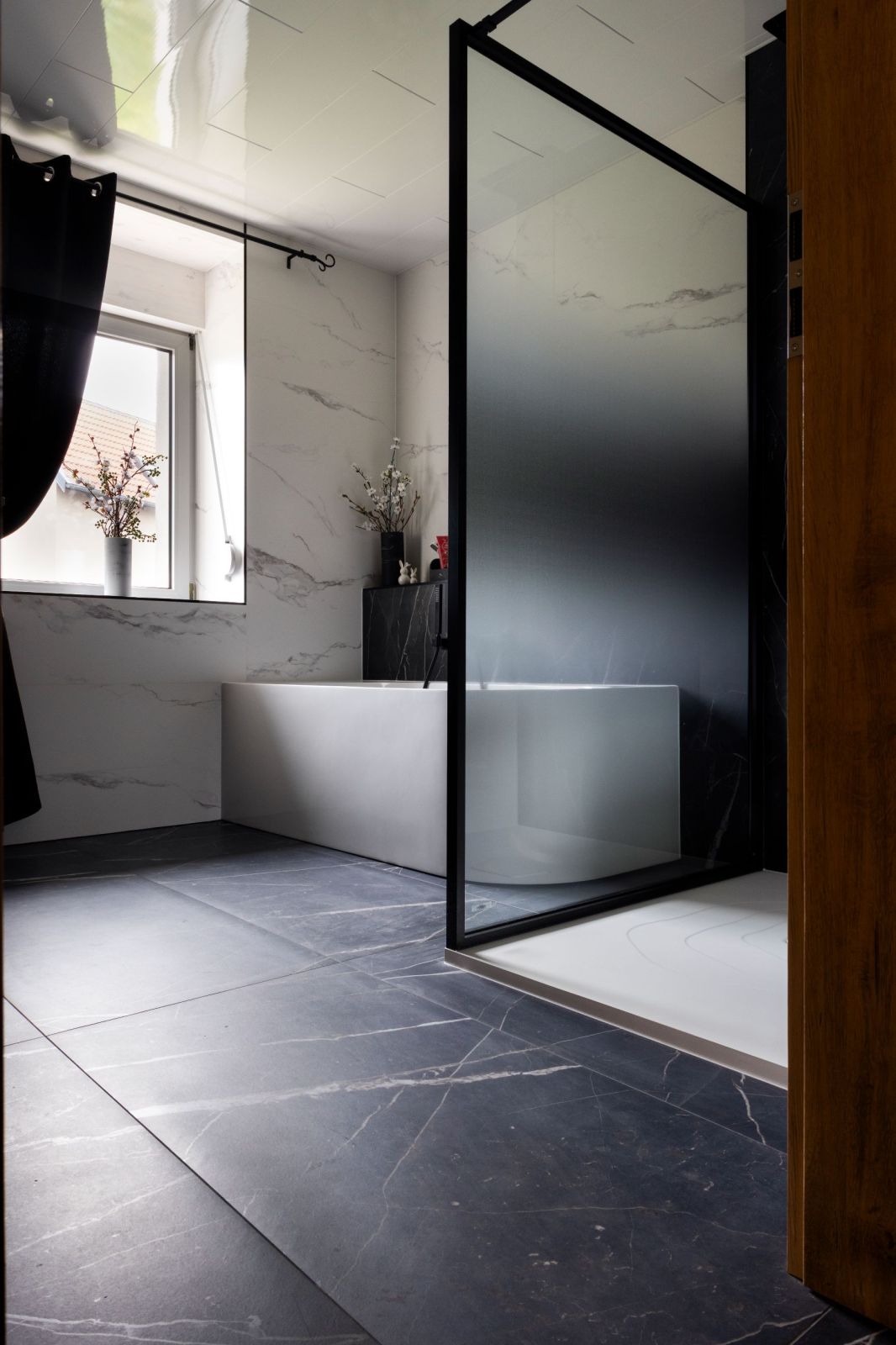 Rénovation salle de bain moderne avec douche, baignoire et carrelage effet marbre noir