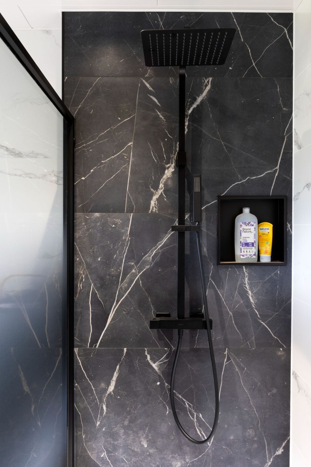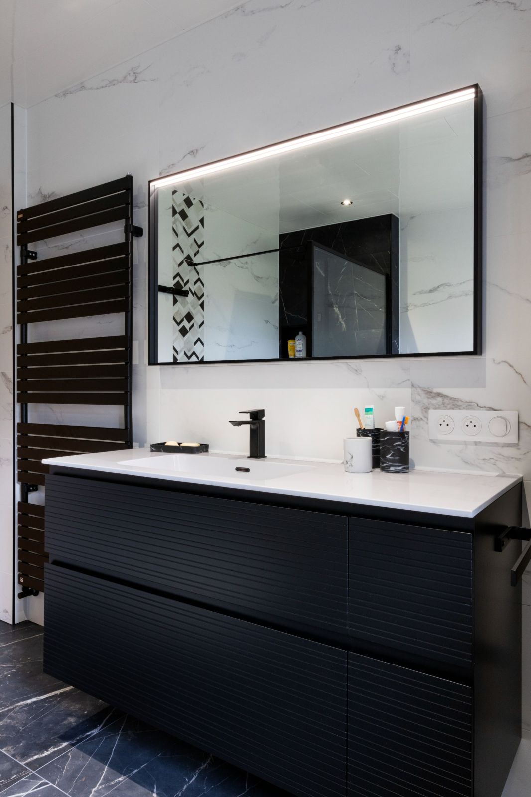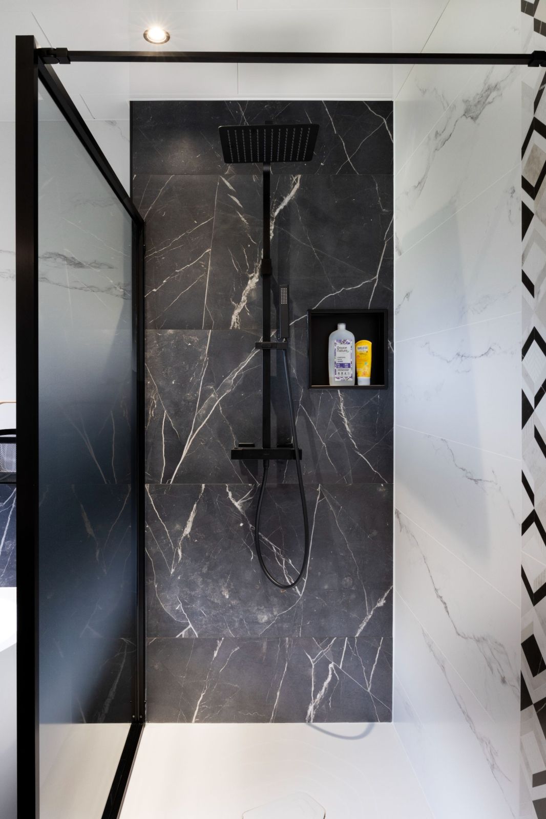 Le contraste entre le marbre noir profond et la faïence blanche veinée apporte du caractère à la pièce, tandis que les éléments noirs (robinetterie, paroi, mobilier) renforcent l’identité contemporaine.