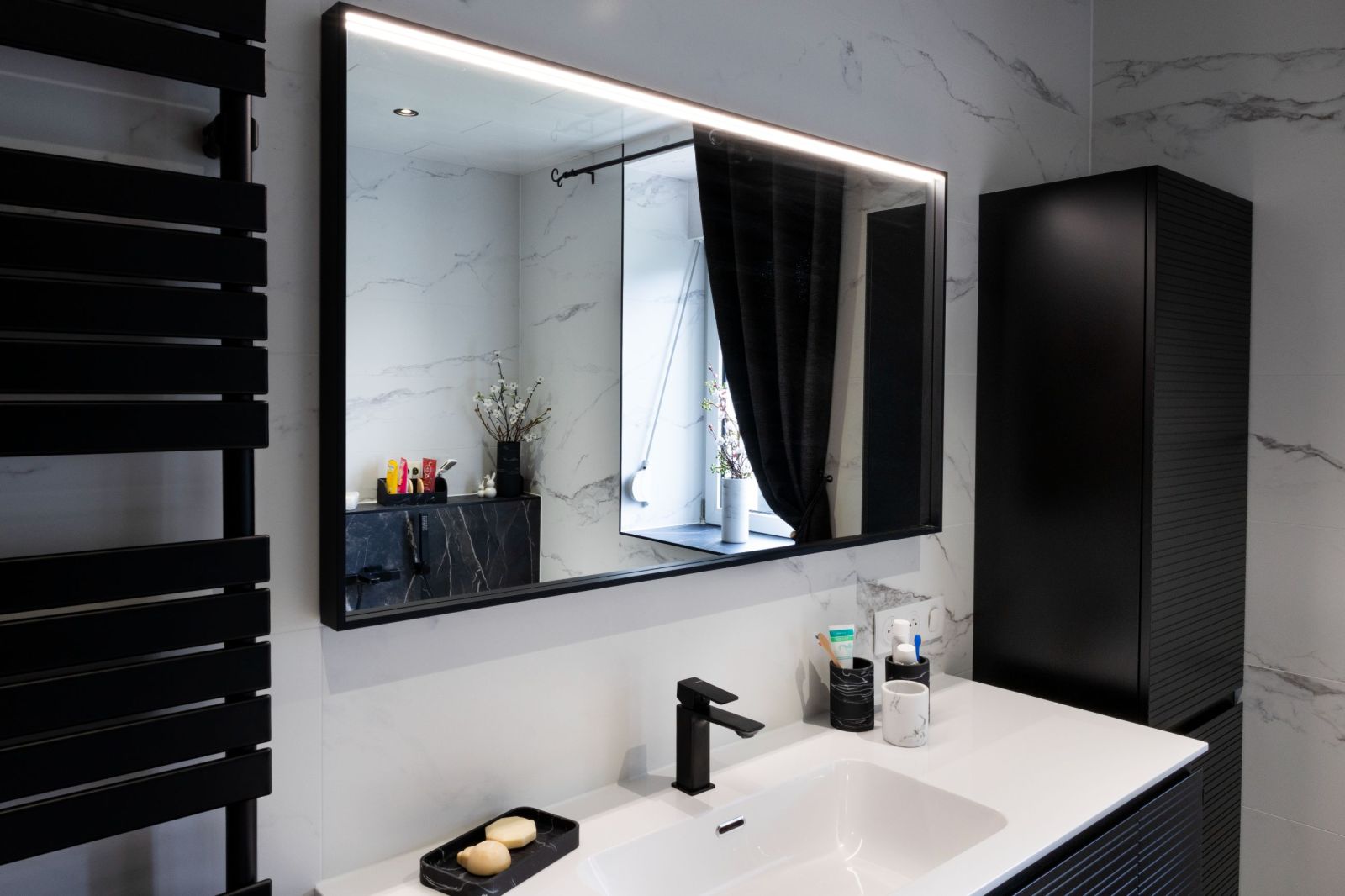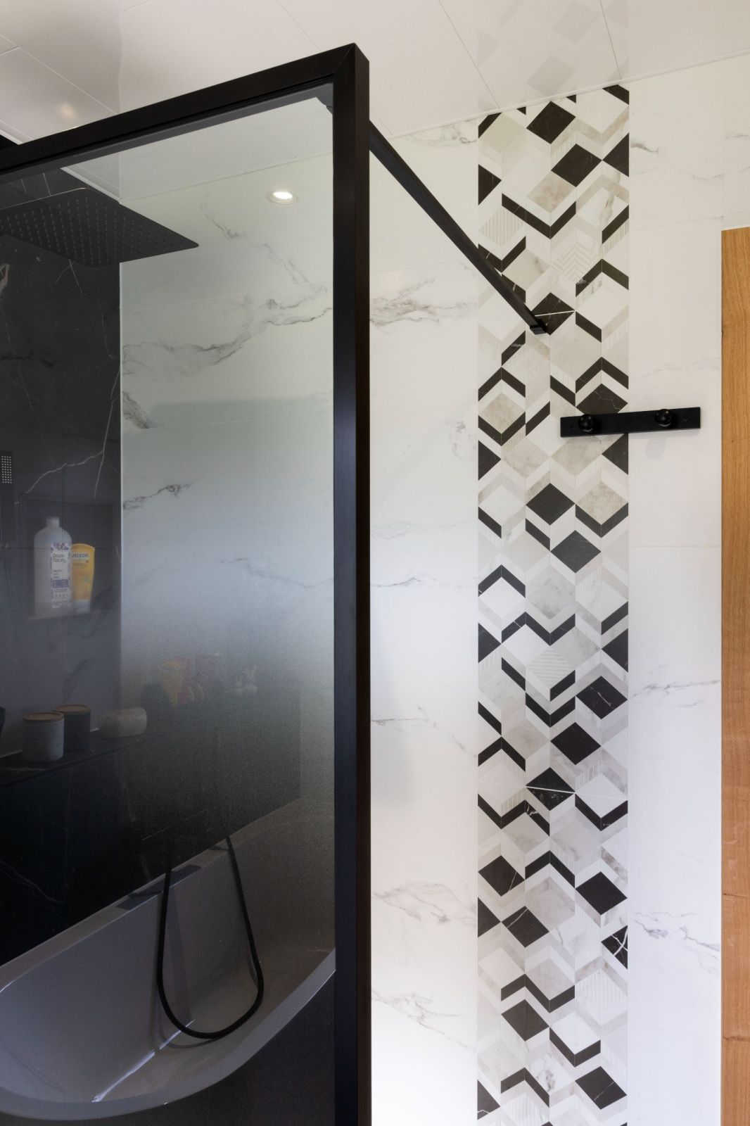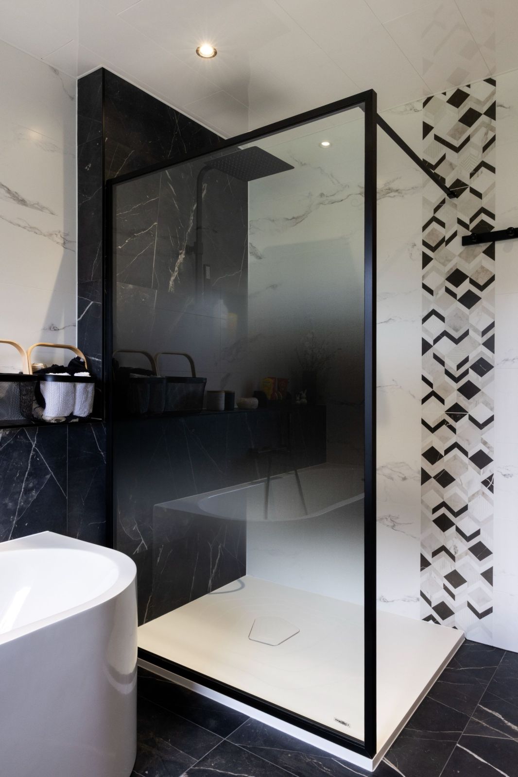 Le contraste entre le marbre noir profond et la faïence blanche veinée apporte du caractère à la pièce, tandis que les éléments noirs (robinetterie, paroi, mobilier) renforcent l’identité contemporaine.
