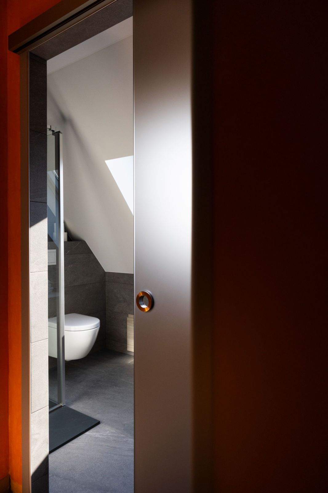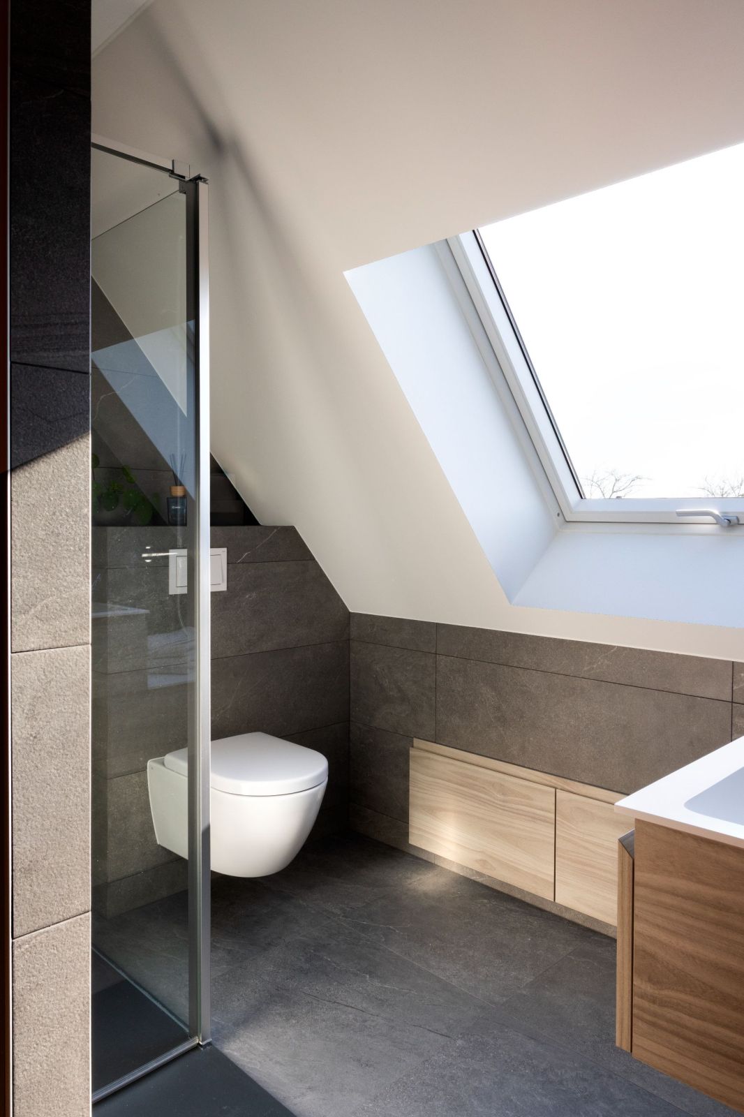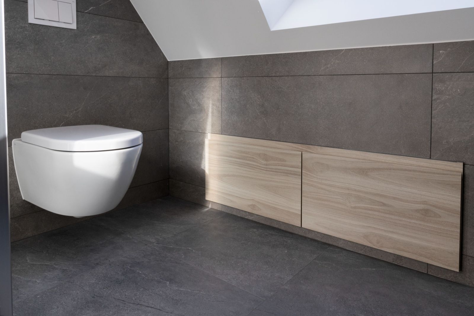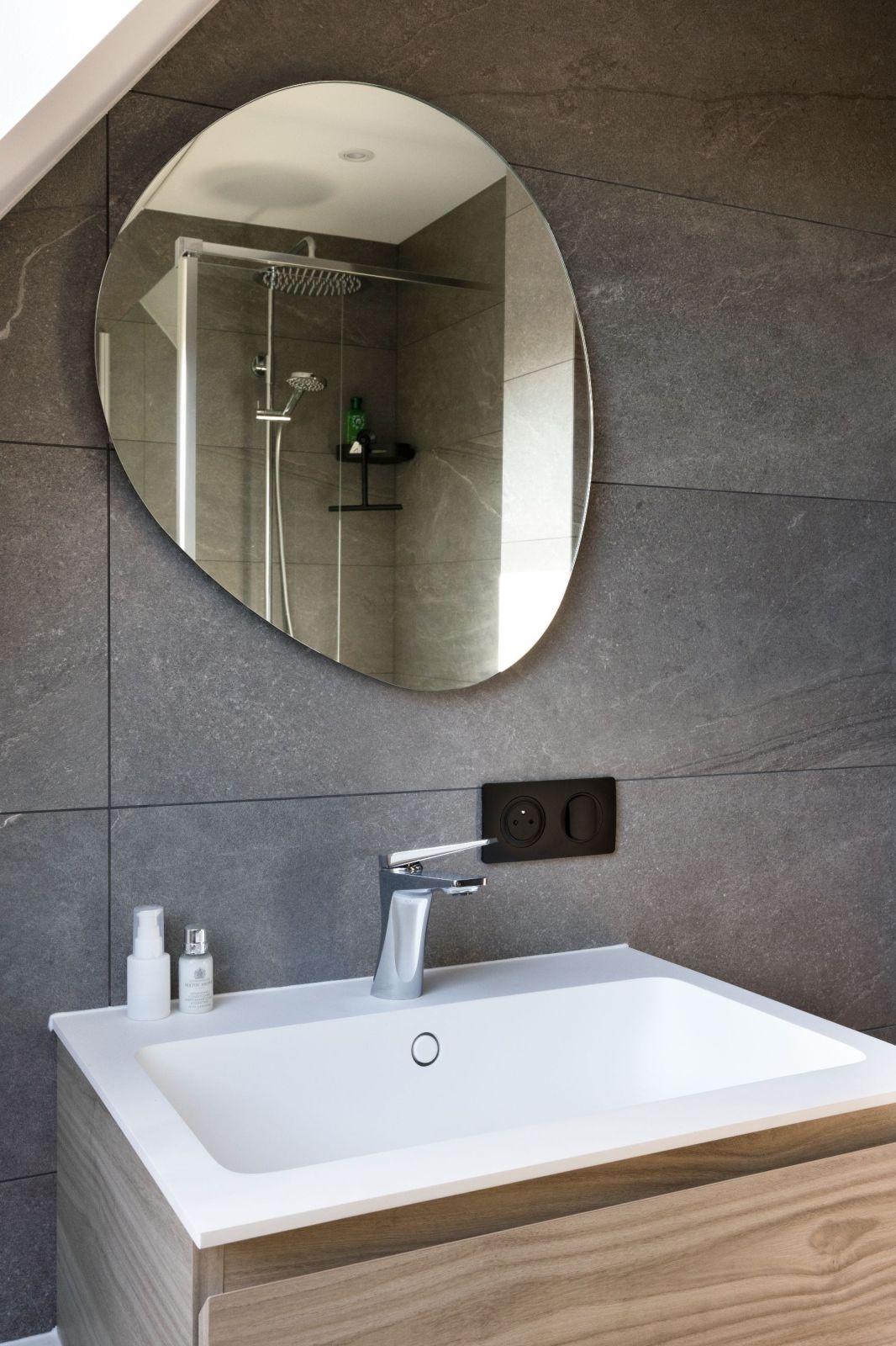 La continuité mur/sol renforce la sensation d’espace, particulièrement importante dans une salle d’eau sous pente.