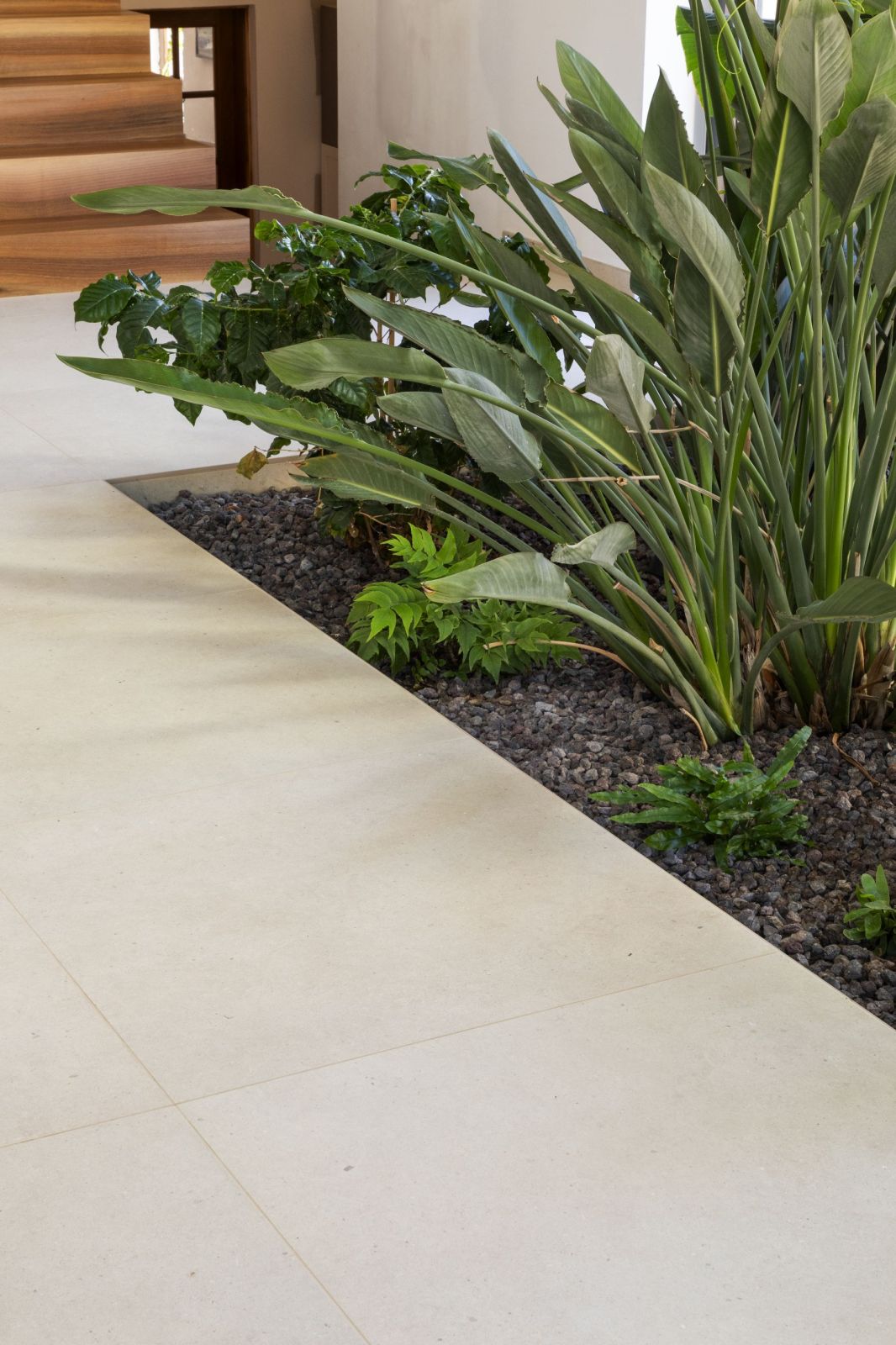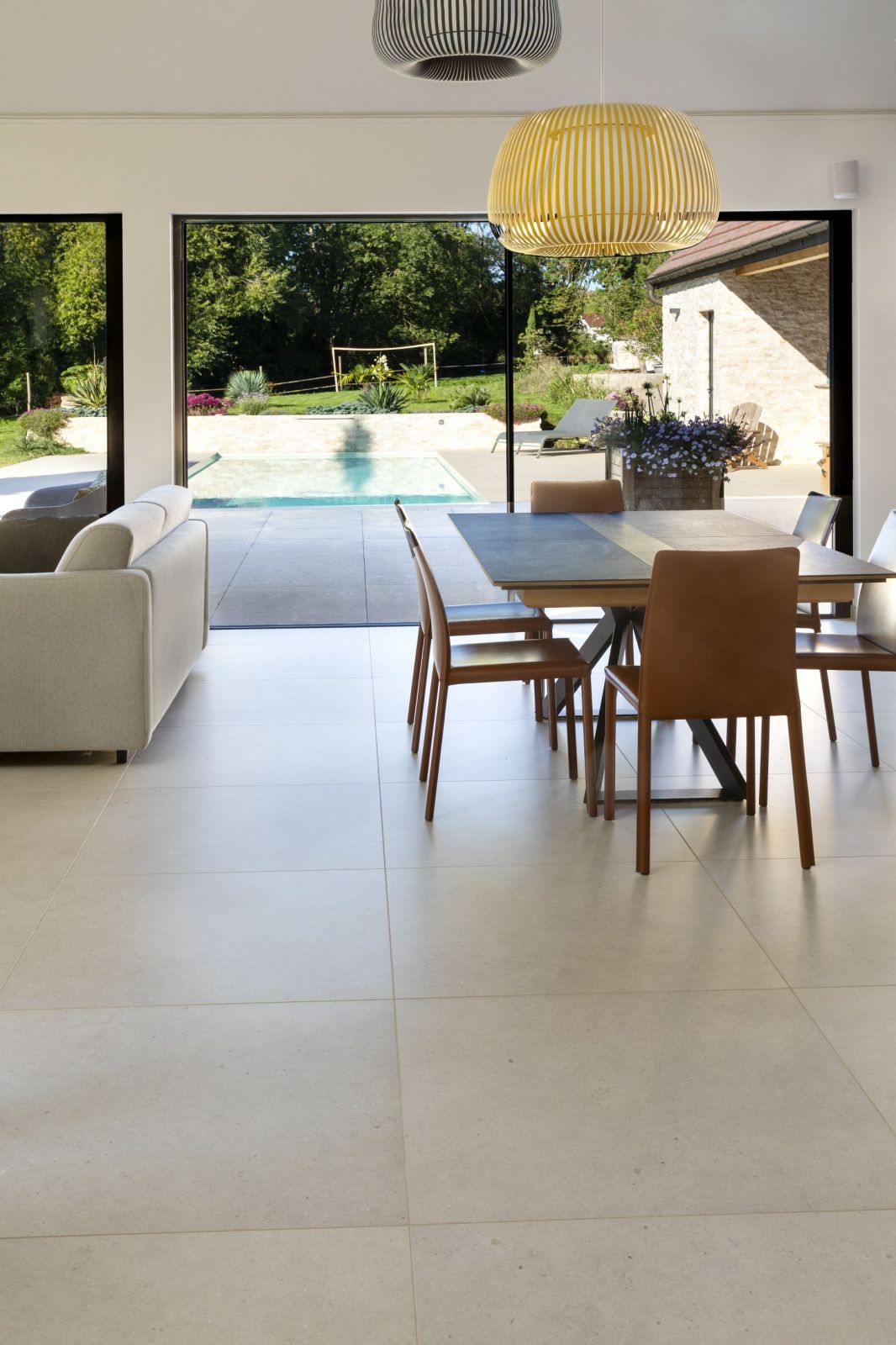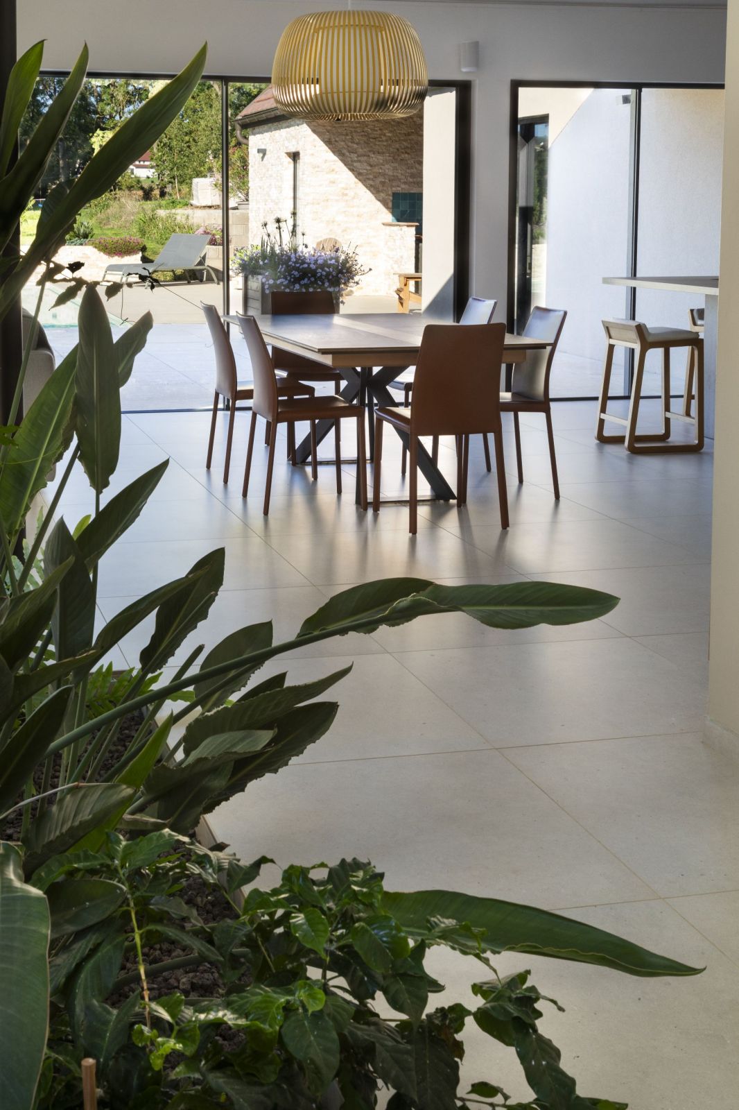 Un sol en grès cérame au style minéral & contemporain, qui sublime la végétation intérieure et les grandes baies vitrées.