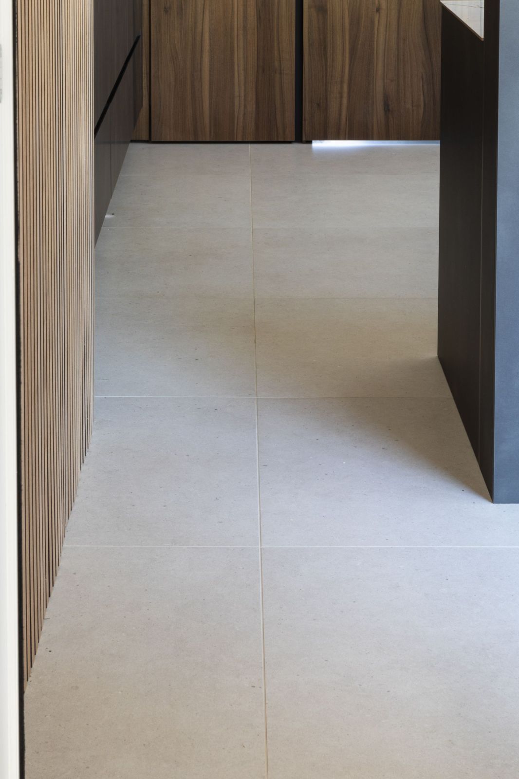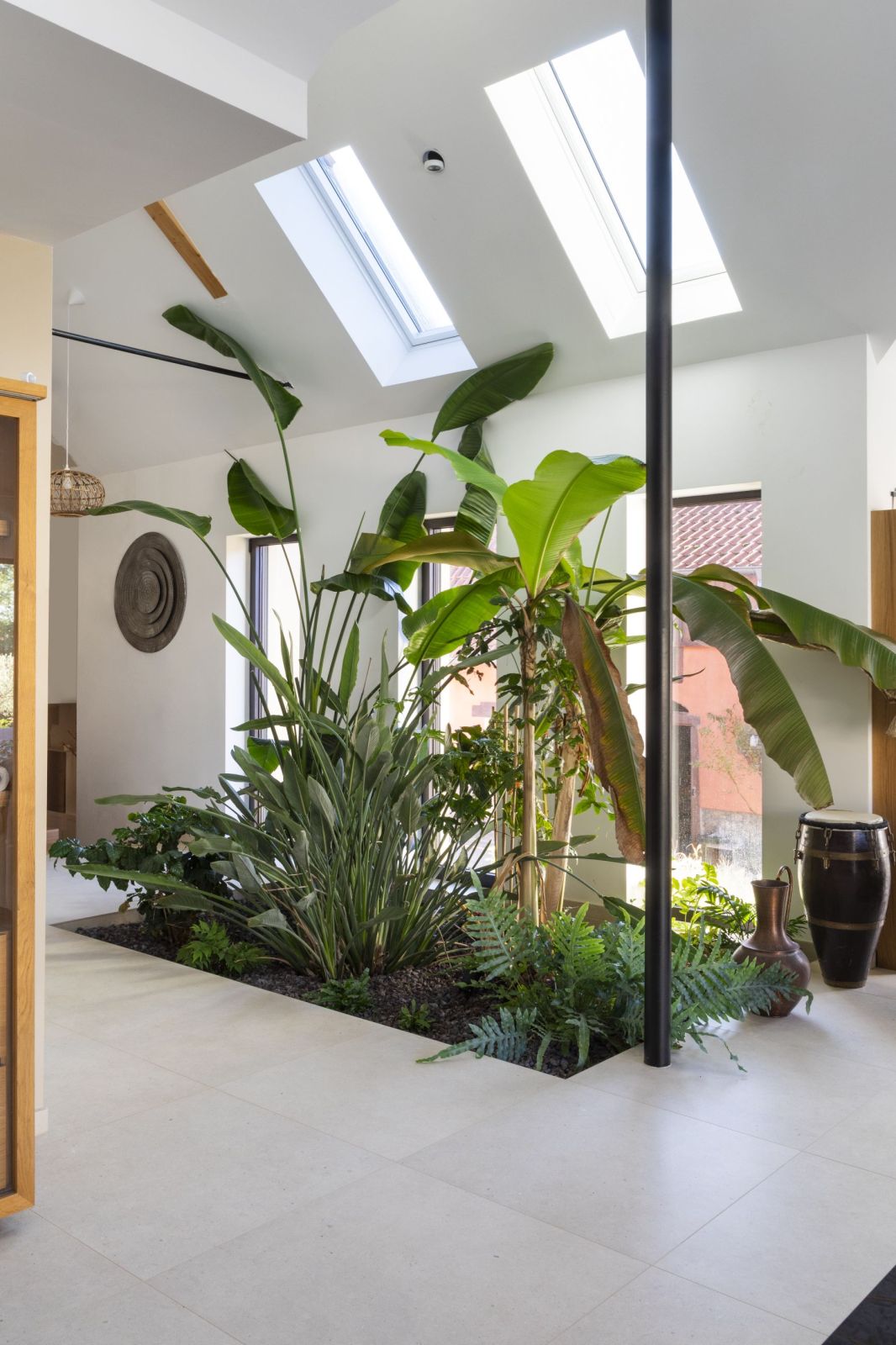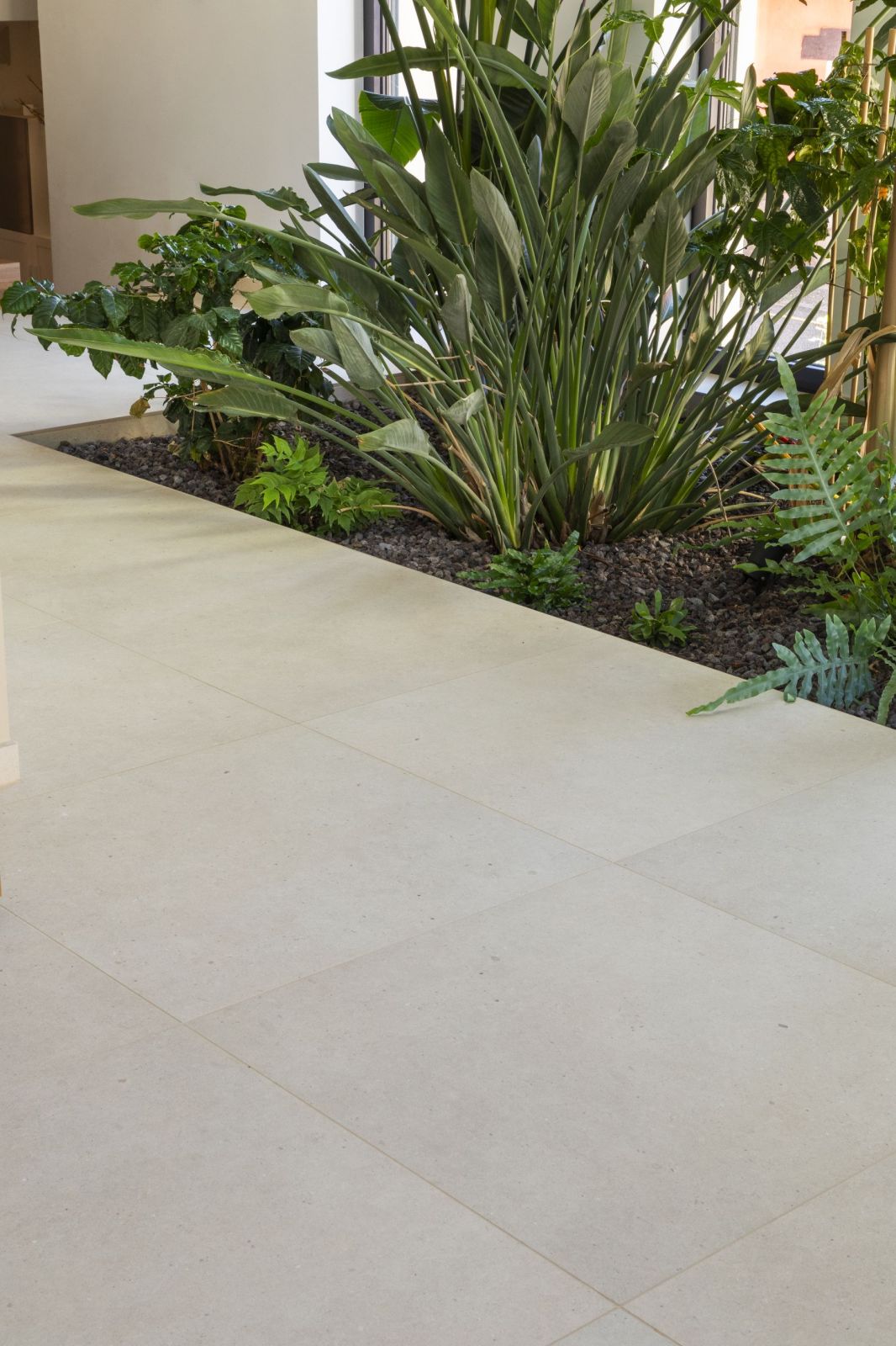 Un sol en grès cérame au style minéral & contemporain, qui sublime la végétation intérieure et les grandes baies vitrées.