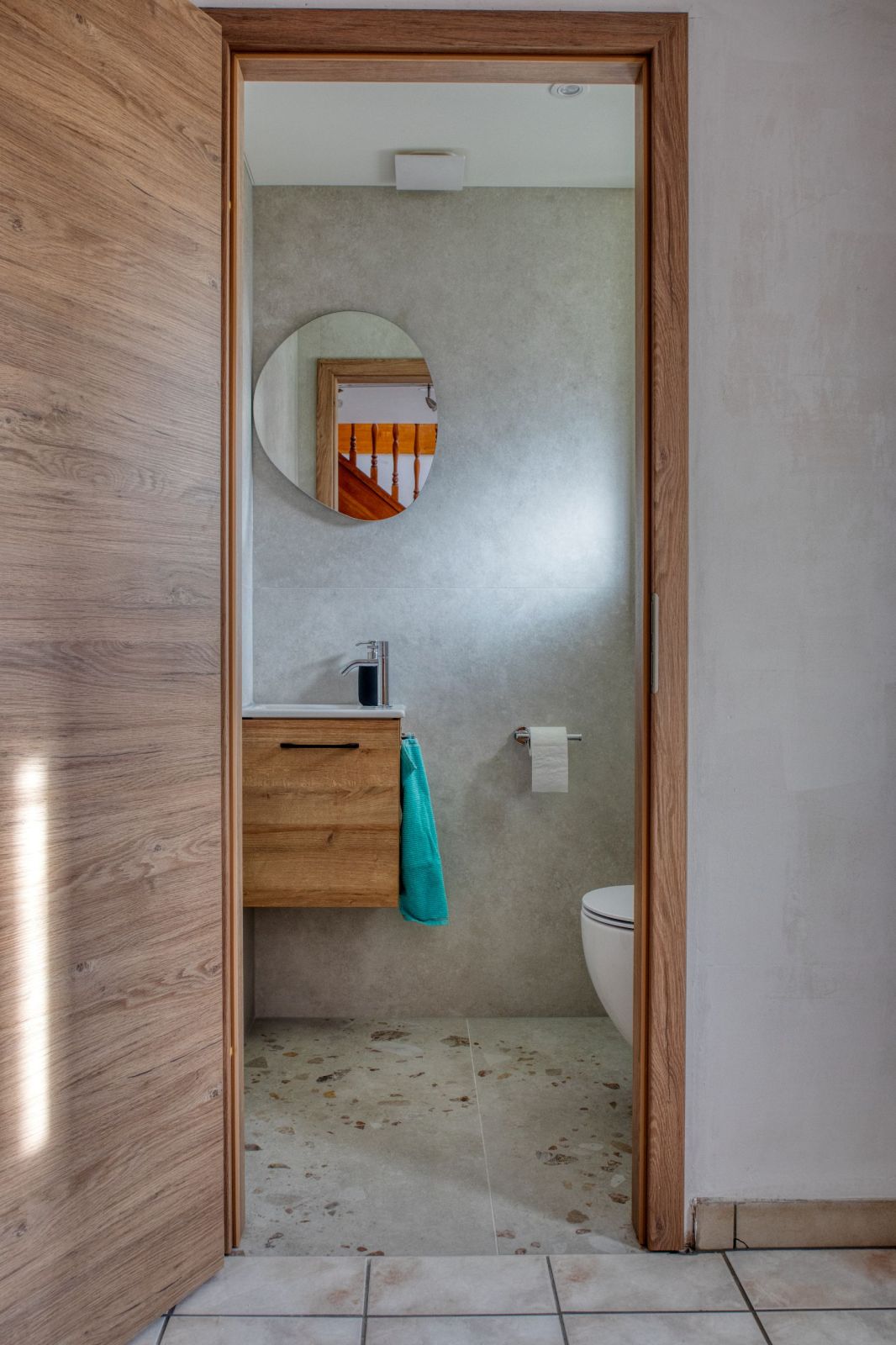 L’association du carrelage texturé, du mobilier bois clair et des accessoires minimalistes apporte une ambiance douce et contemporaine à cette petite pièce, sans négliger la fonctionnalité.