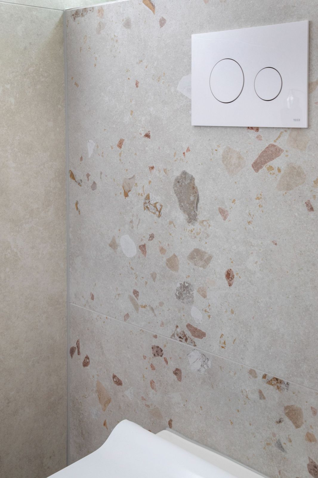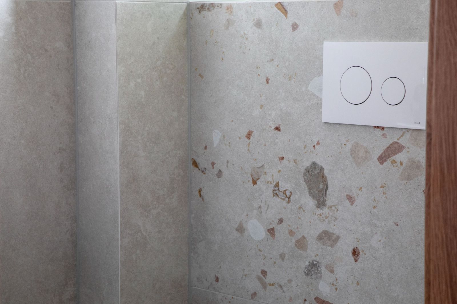 Pose d’un carrelage grand format effet béton au sol et au mur de la COLLECTION I CEMENTI