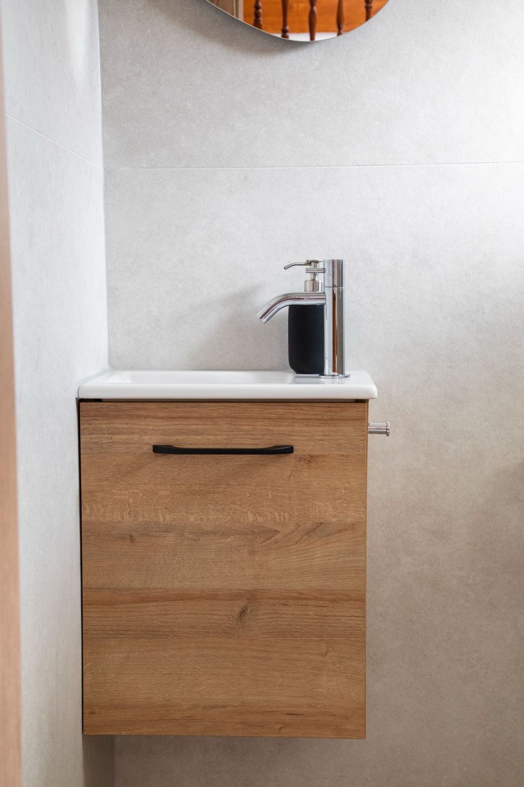 Installation d’un lave-mains suspendu avec meuble finition bois