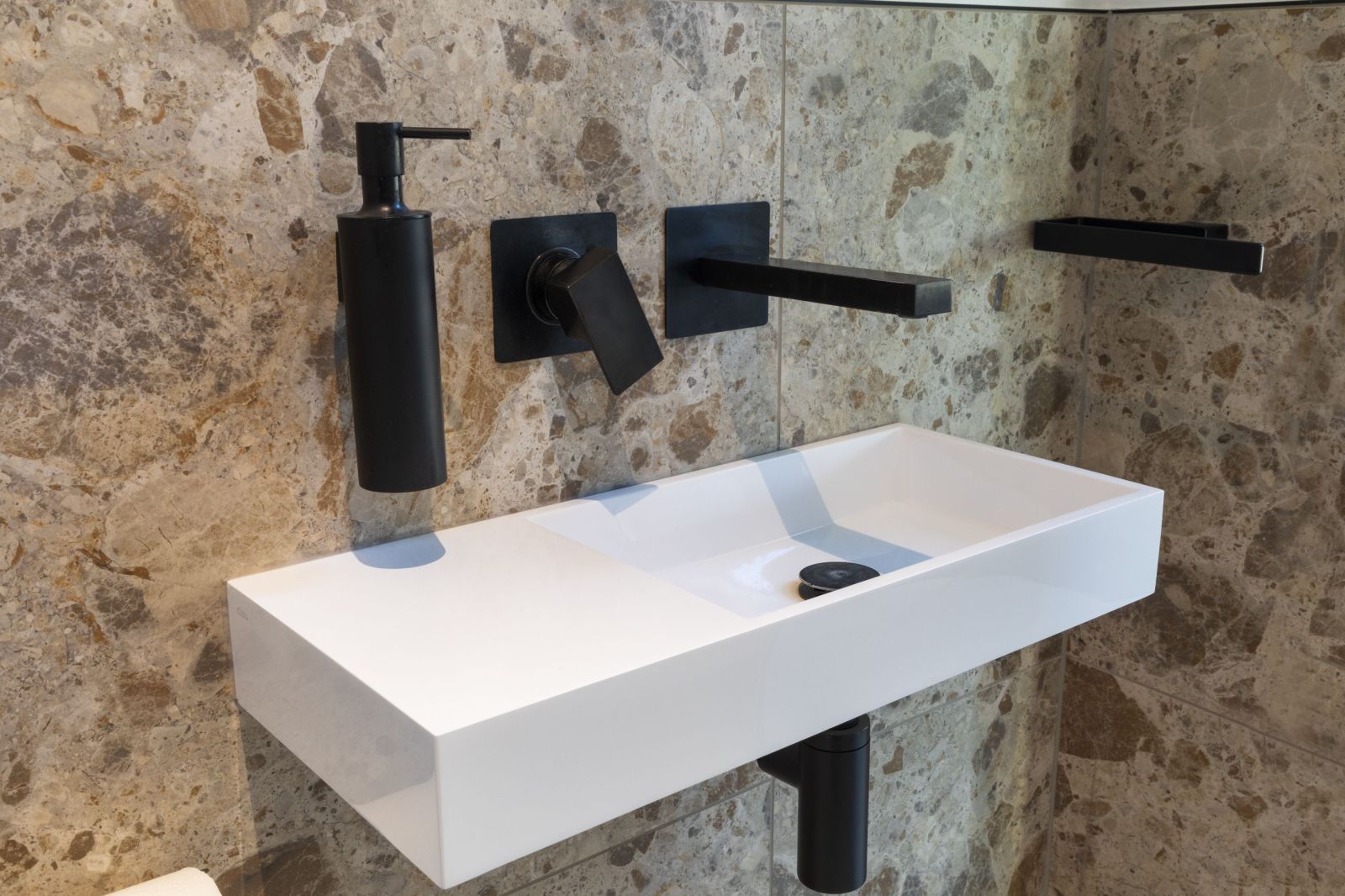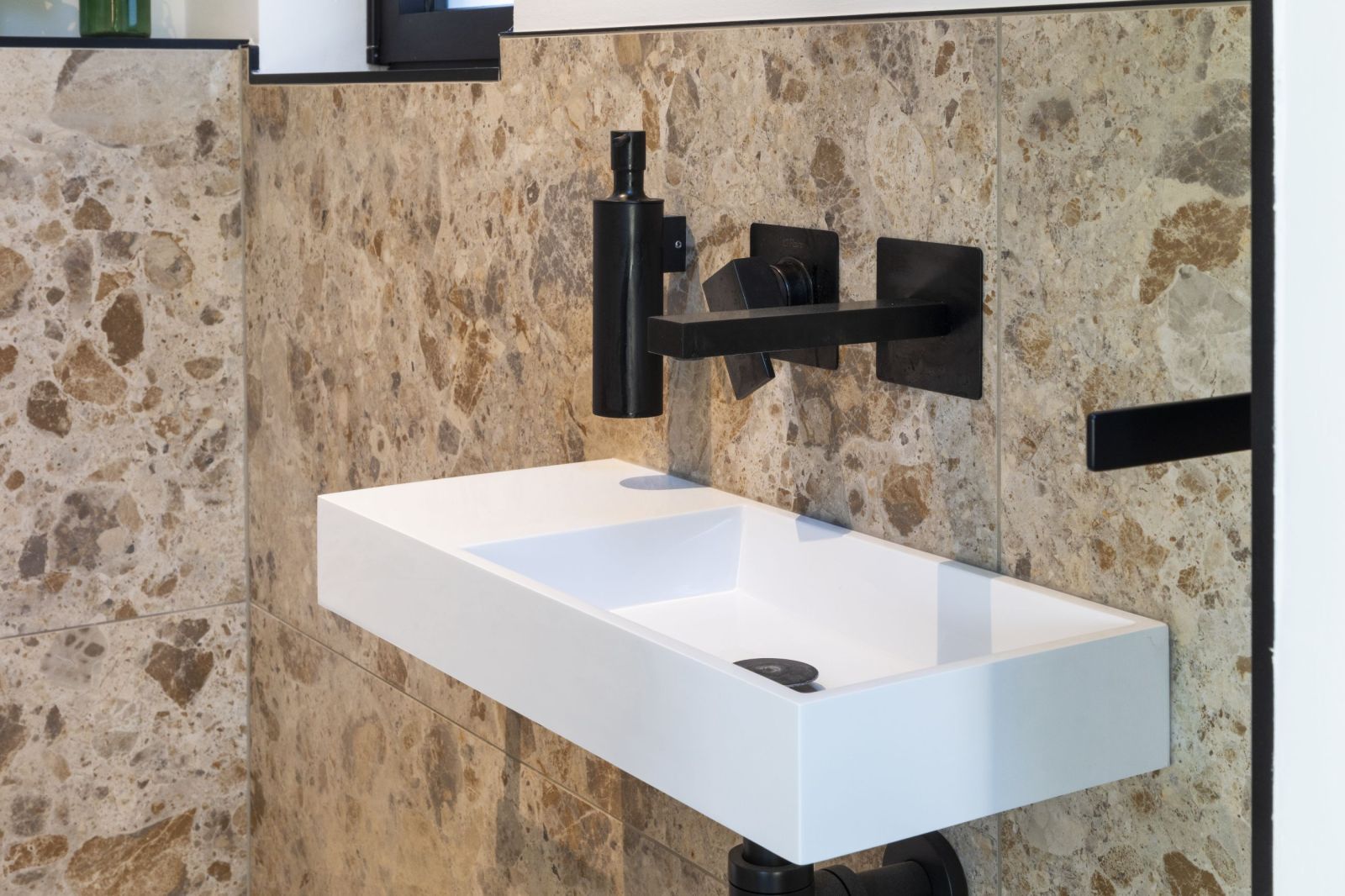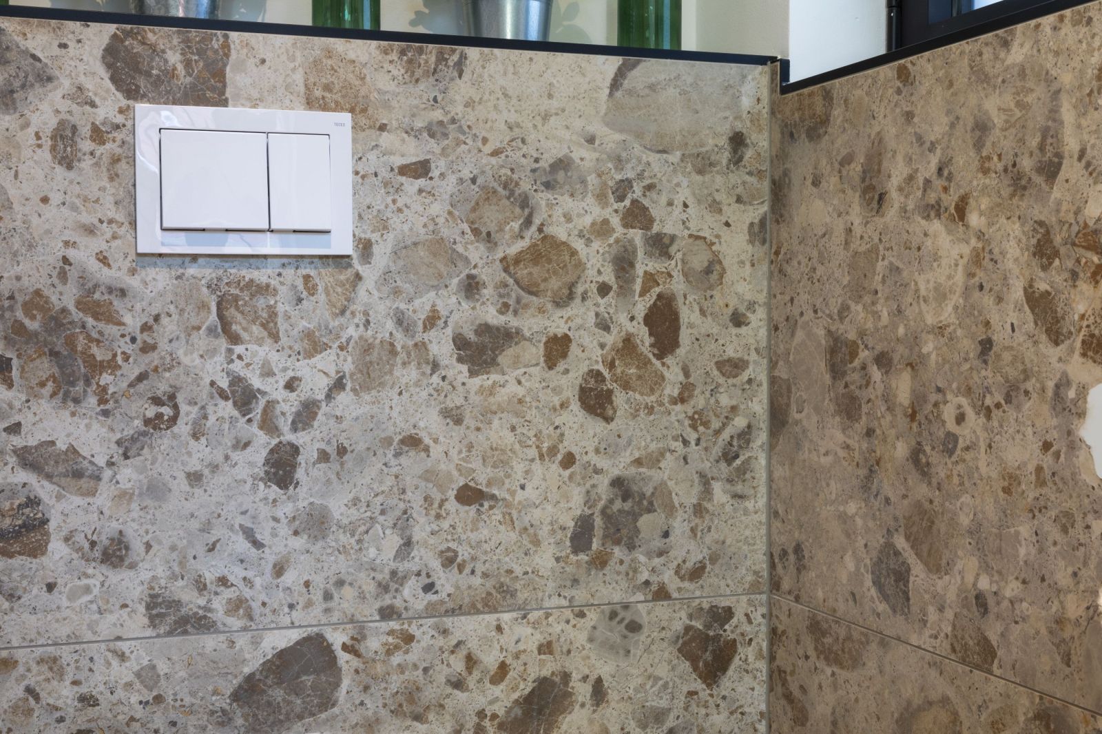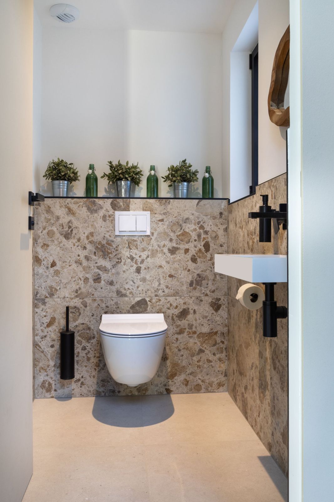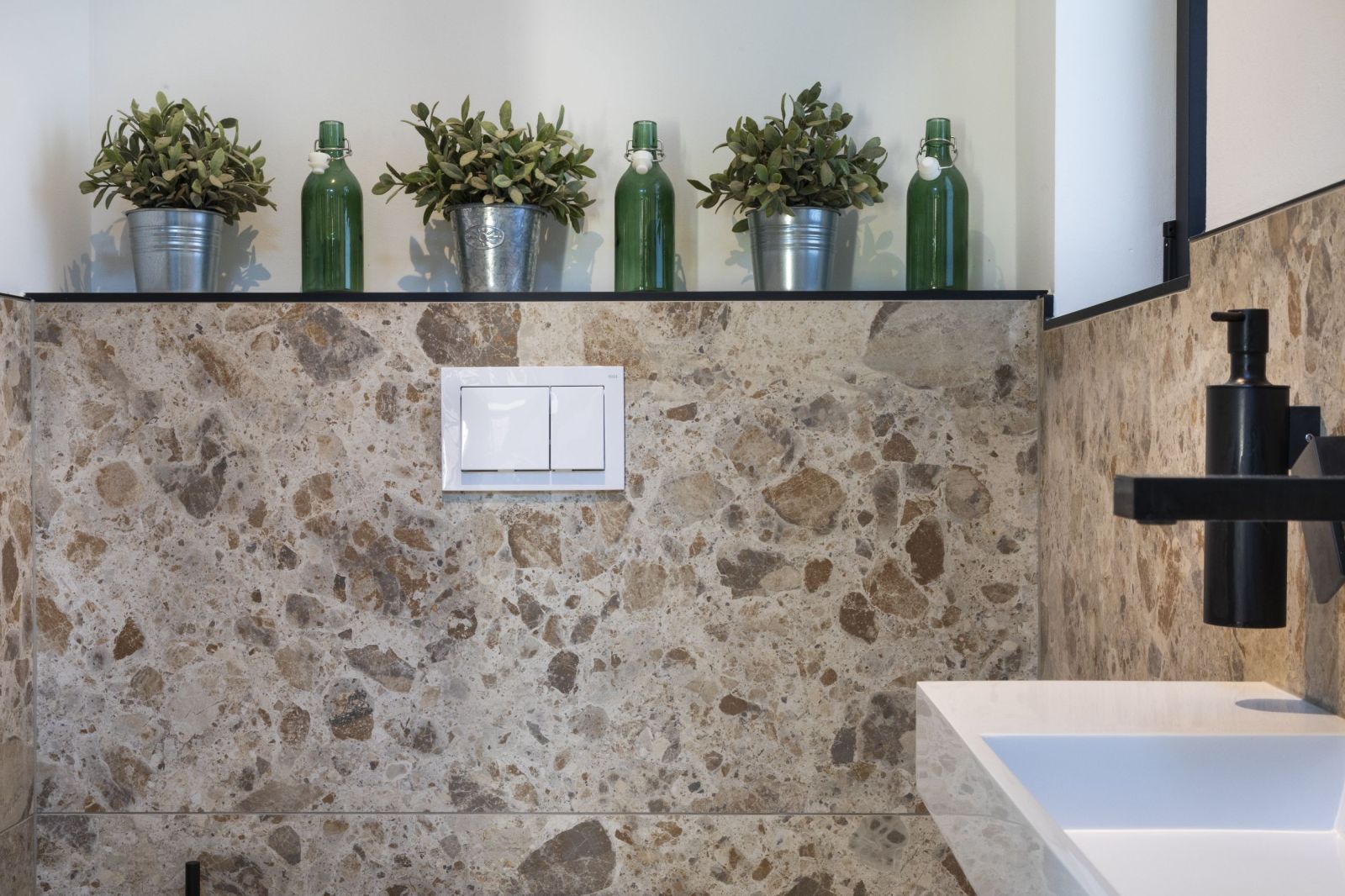 La palette minérale du revêtement, associée à la robinetterie noire mate, donne à ces toilettes un style à la fois épuré et audacieux. La niche haute décorative, agrémentée de plantes et de verreries, vient parfaire l’équilibre entre esthétisme et praticité.