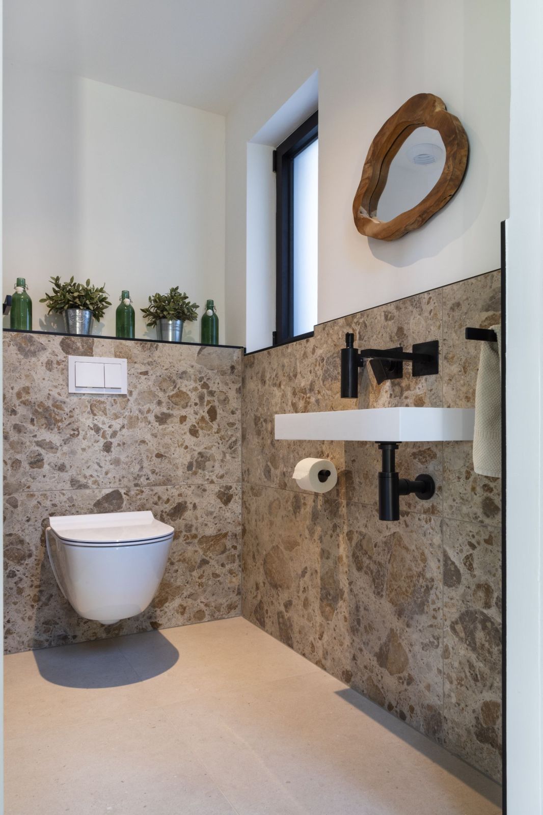 Un espace WC raffiné pensé dès la conception de la maison, mêlant esthétique contemporaine et praticité quotidienne, avec des matériaux naturels et des lignes graphiques.