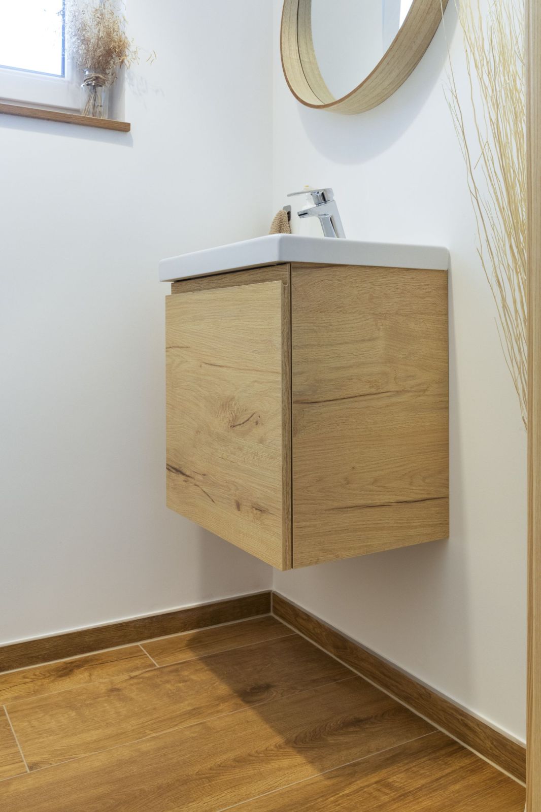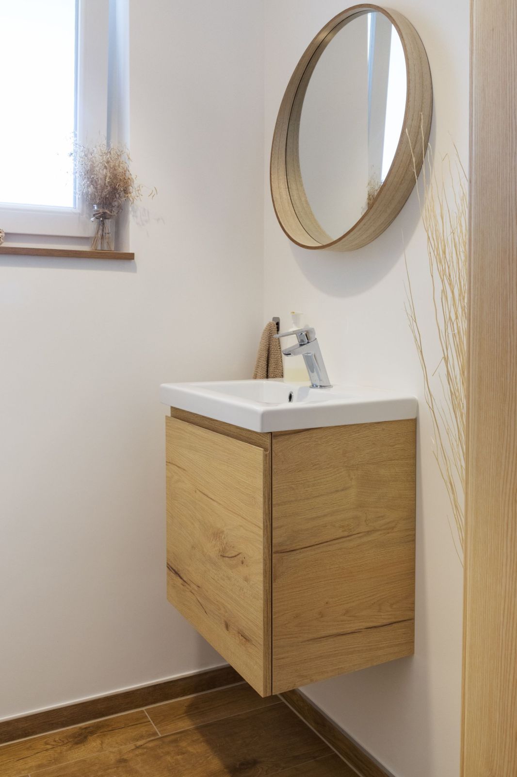 Meuble vasque suspendu en finition bois avec miroir rond assorti