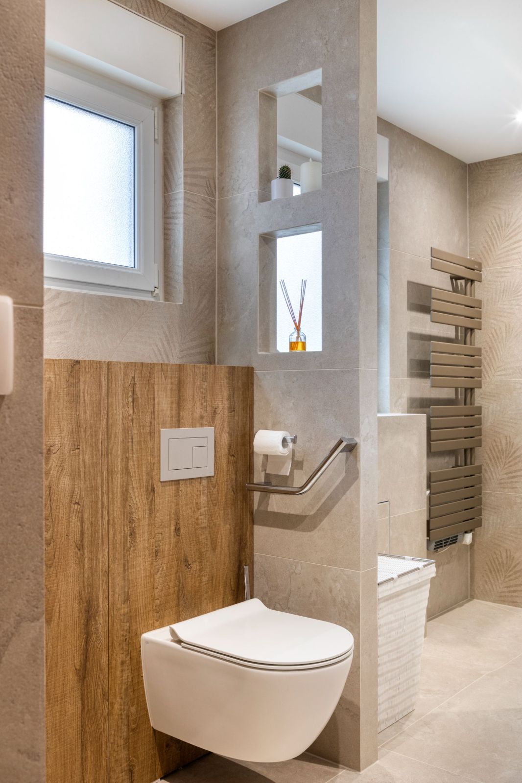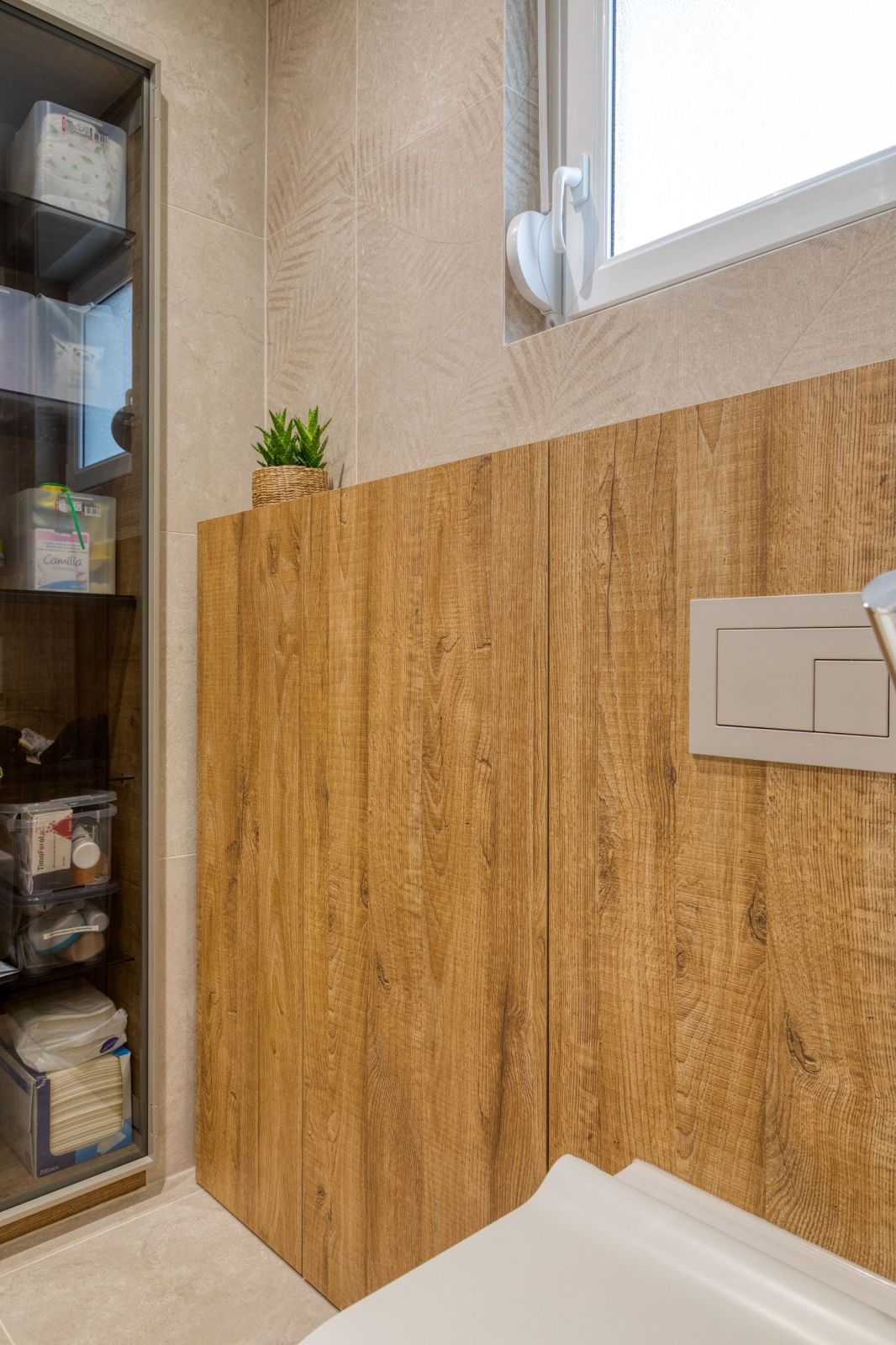 Habillage du bâti-support WC en bois ton chêne pour réchauffer l’ambiance et créer un bel équilibre matière