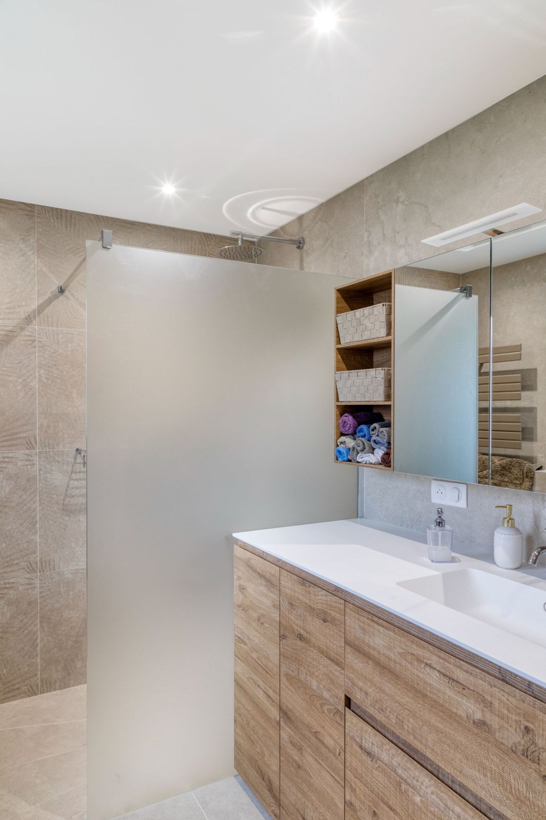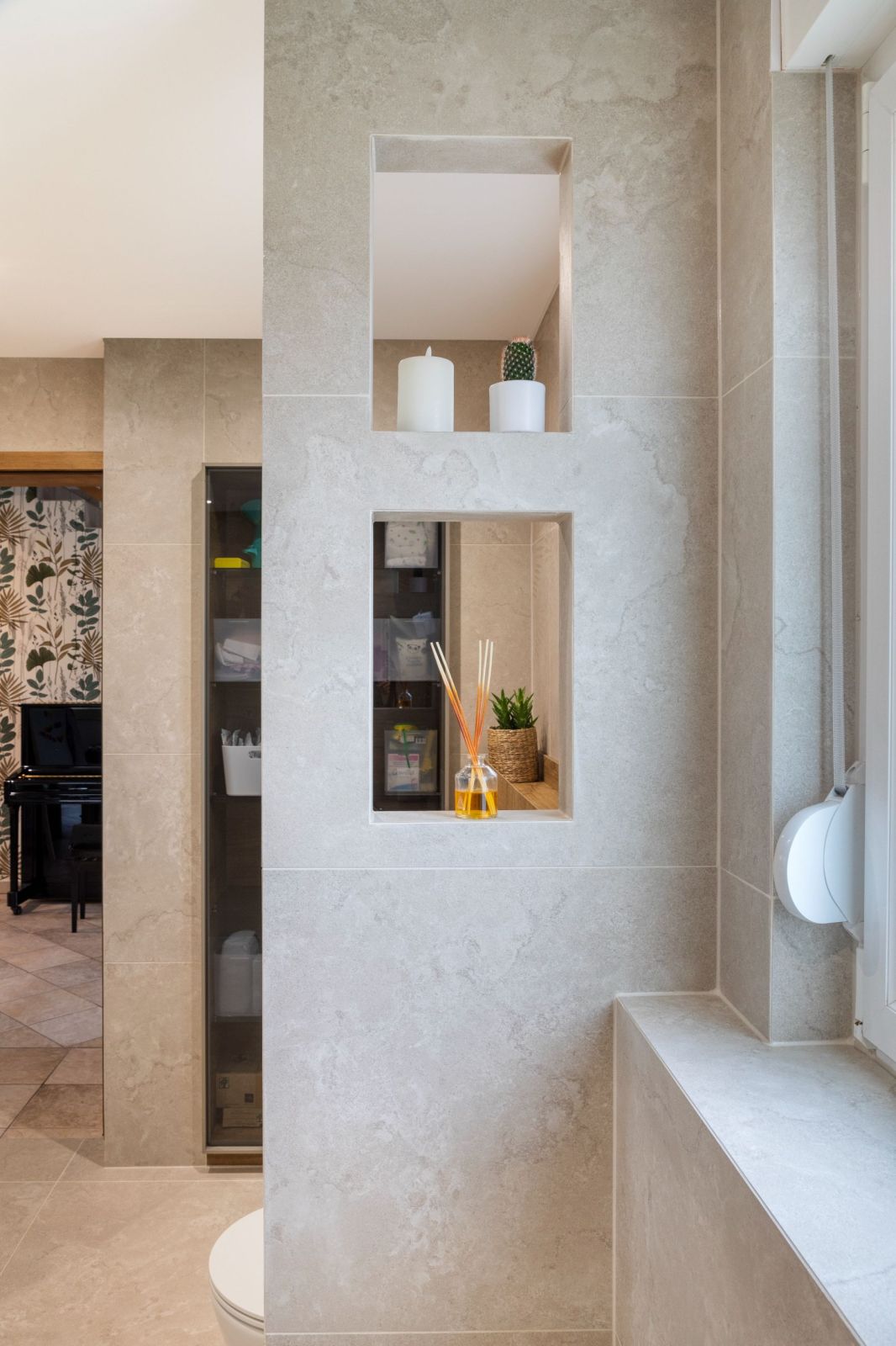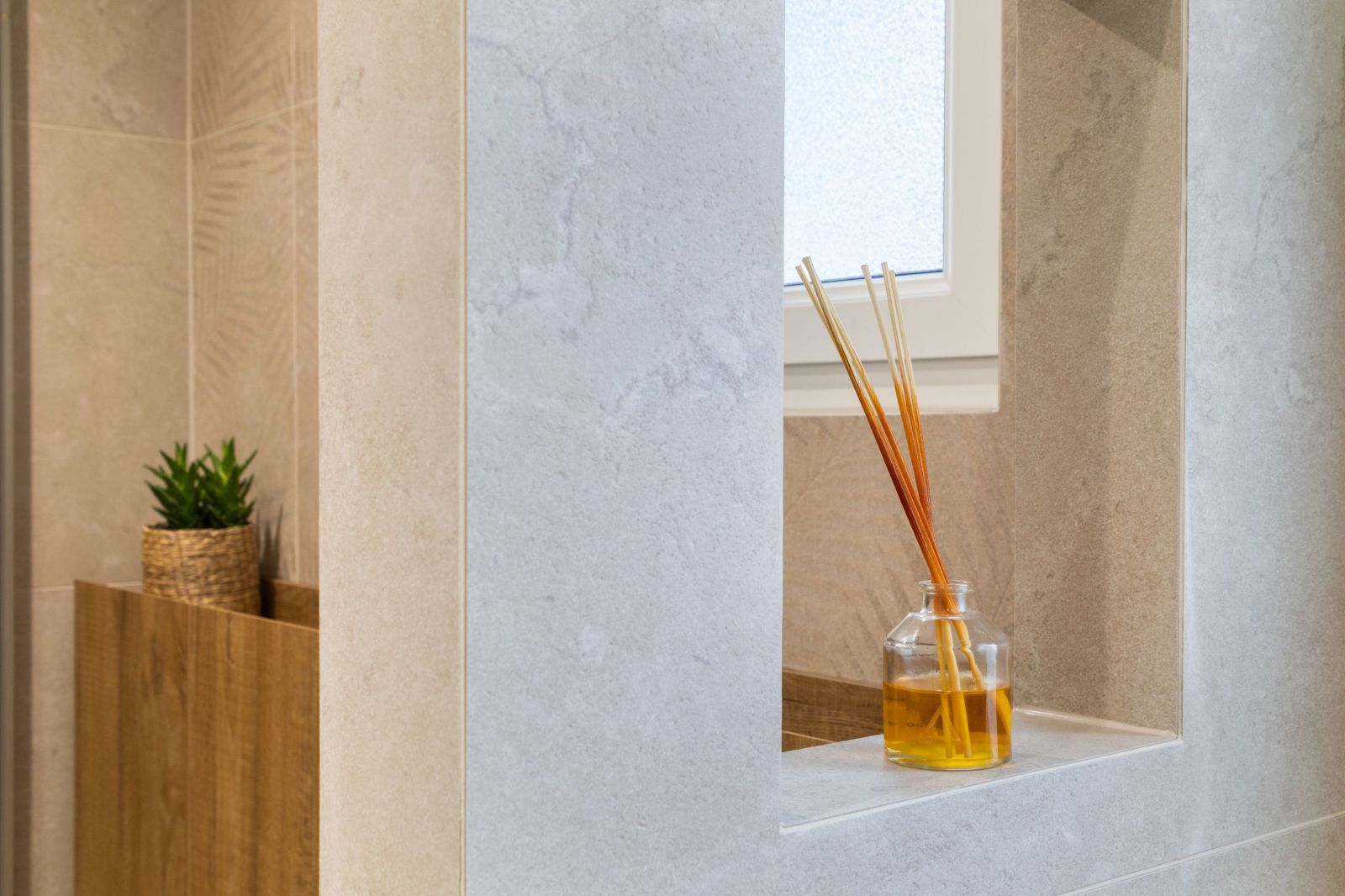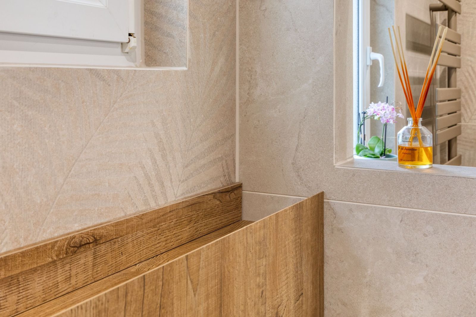 Ce projet marie la pierre céramique aux nuances beiges et des éléments bois pour une ambiance naturelle et chaleureuse. Chaque détail a été pensé pour offrir un confort optimal et un rendu visuel calme et enveloppant, parfaitement intégré à l’univers de la maison.