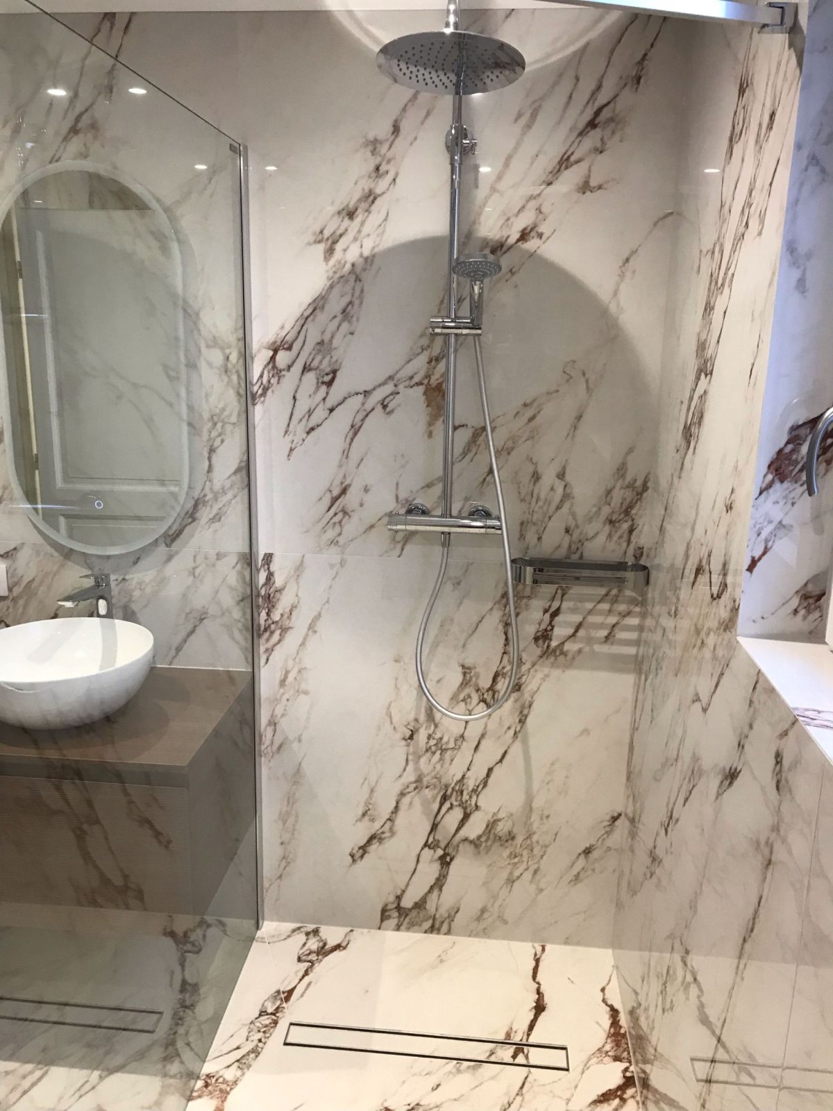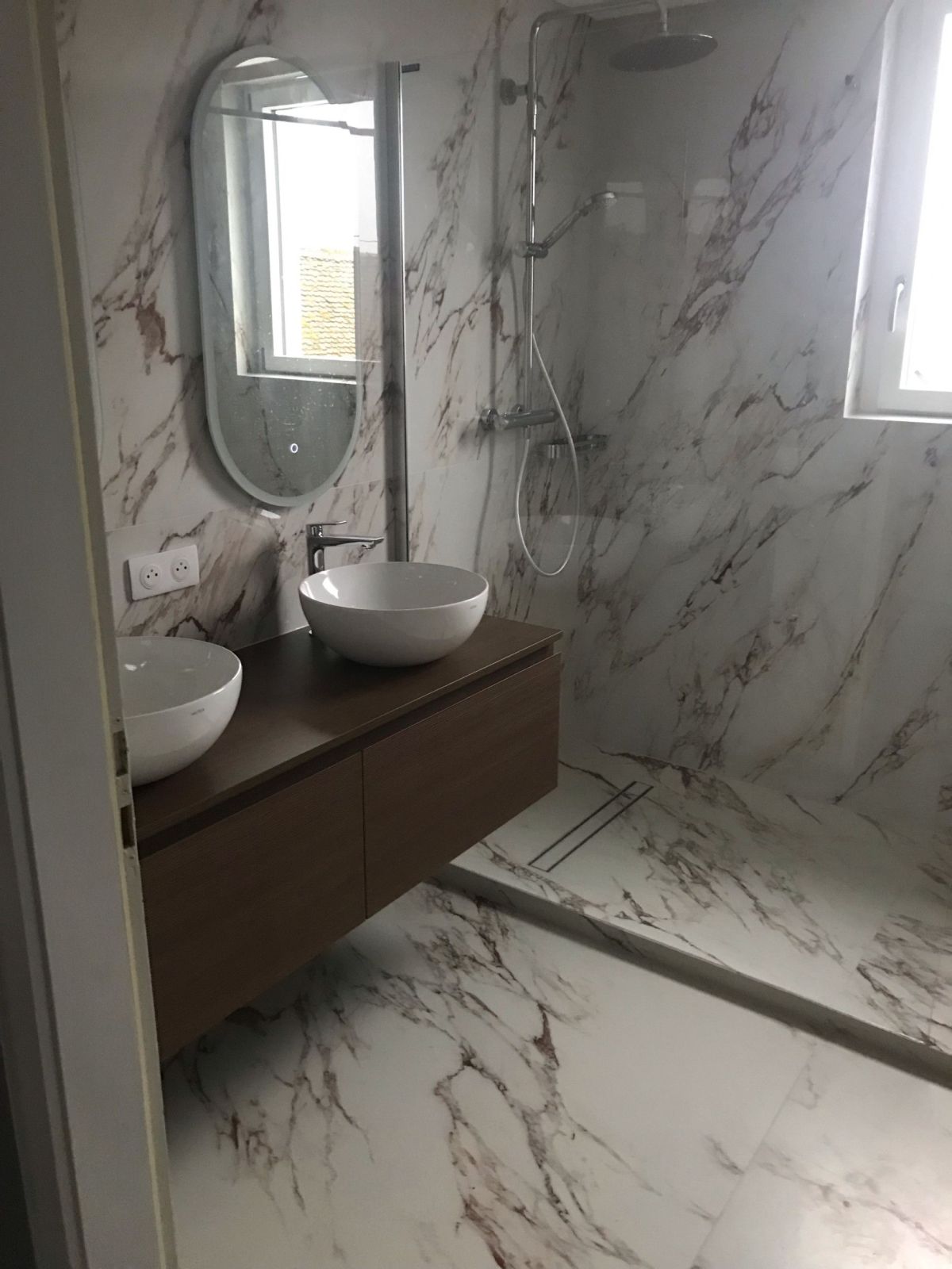 Aux murs, les plaques XXL 120x278 créent un effet spectaculaire et homogène, limitant les joints pour un rendu épuré et haut de gamme. Les veines marbrées, subtilement contrastées, apportent profondeur et raffinement à la douche à l’italienne comme à l’espace vasque.