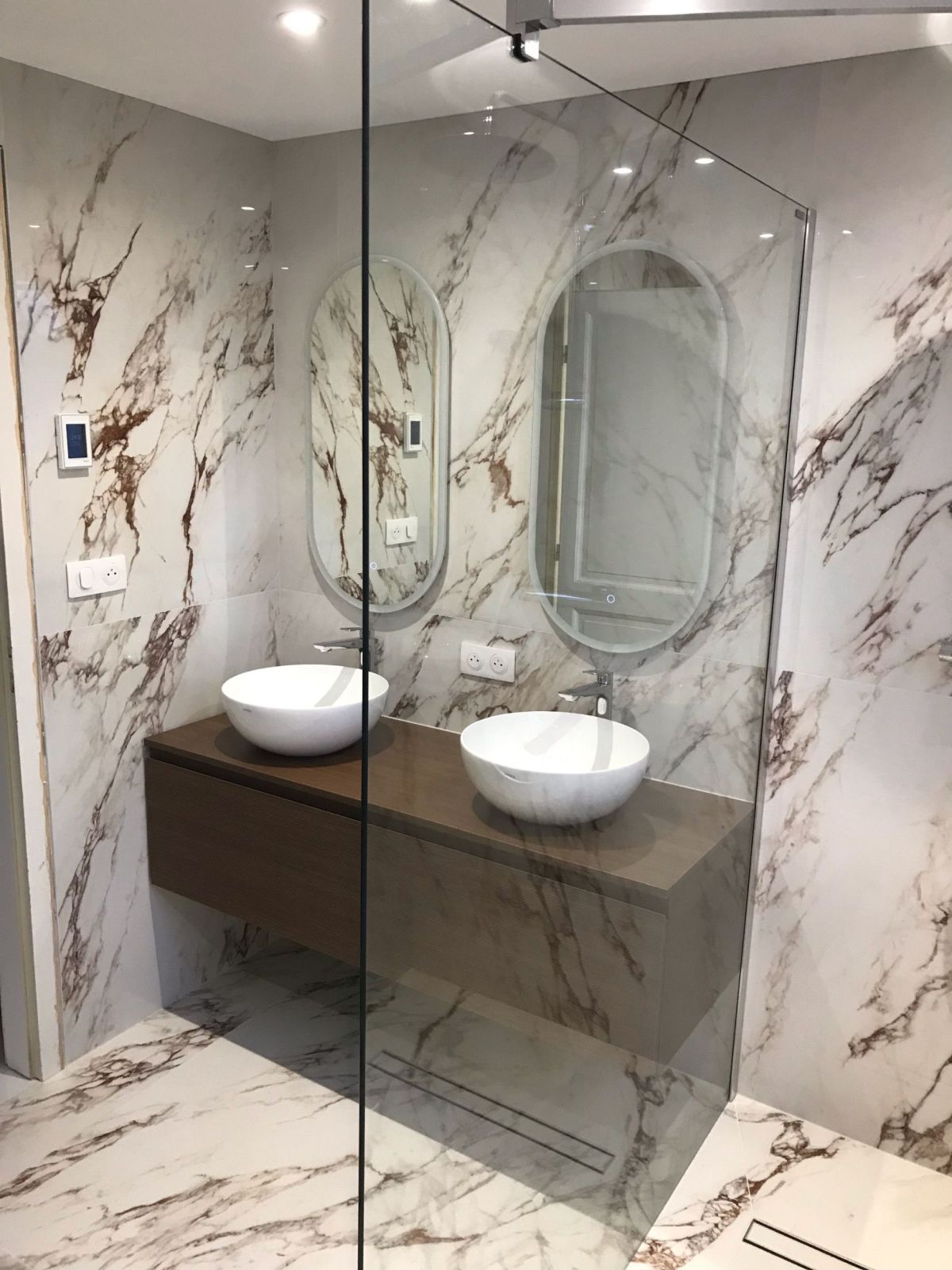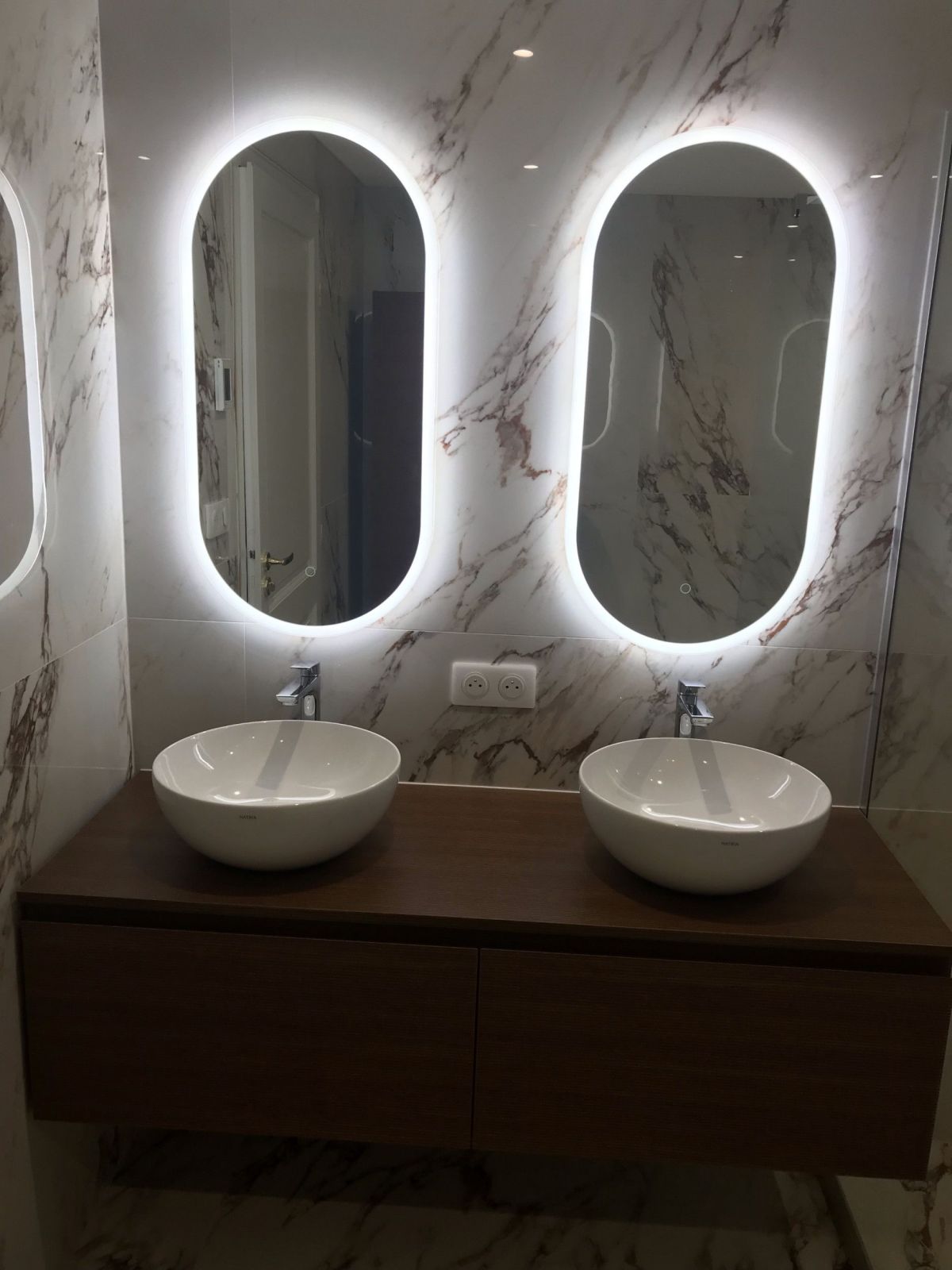 Le mobilier suspendu LIME 2.0 en finition Rigatino Tabacco, associé à une double vasque, vient réchauffer l’ensemble par sa teinte bois texturée. L’équilibre entre minéral noble et bois chaleureux crée une atmosphère sophistiquée et contemporaine.