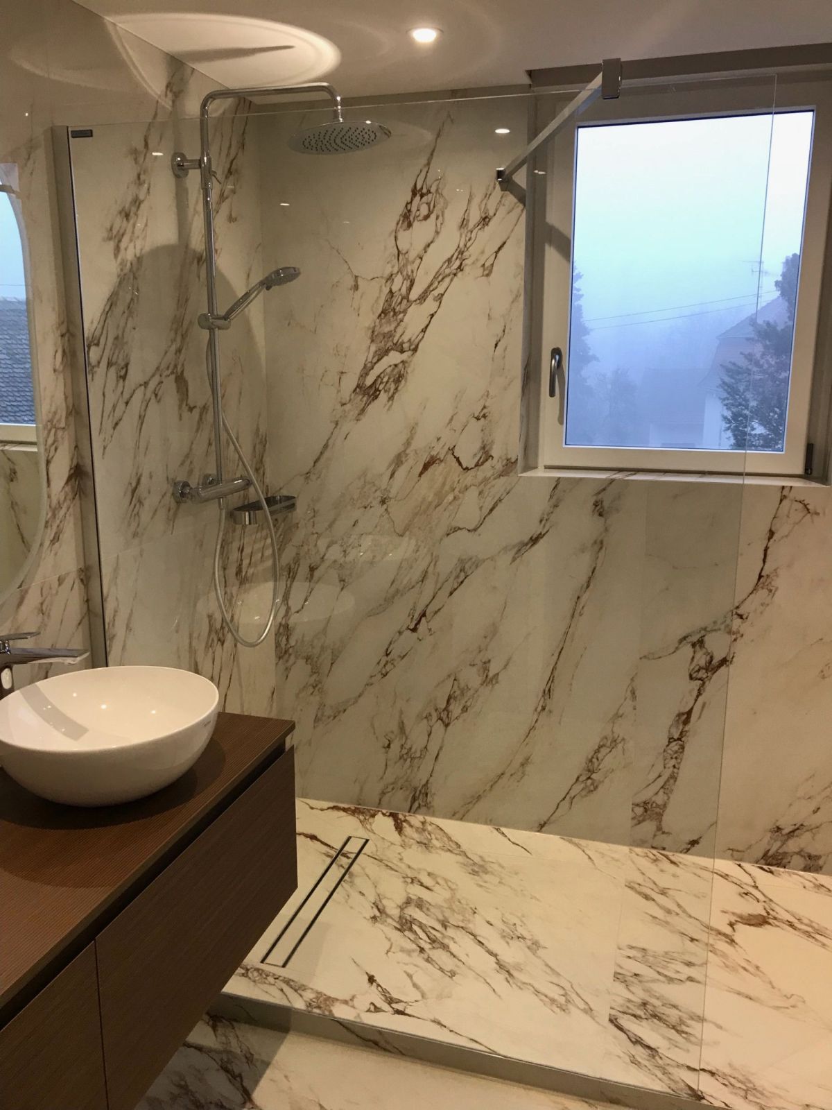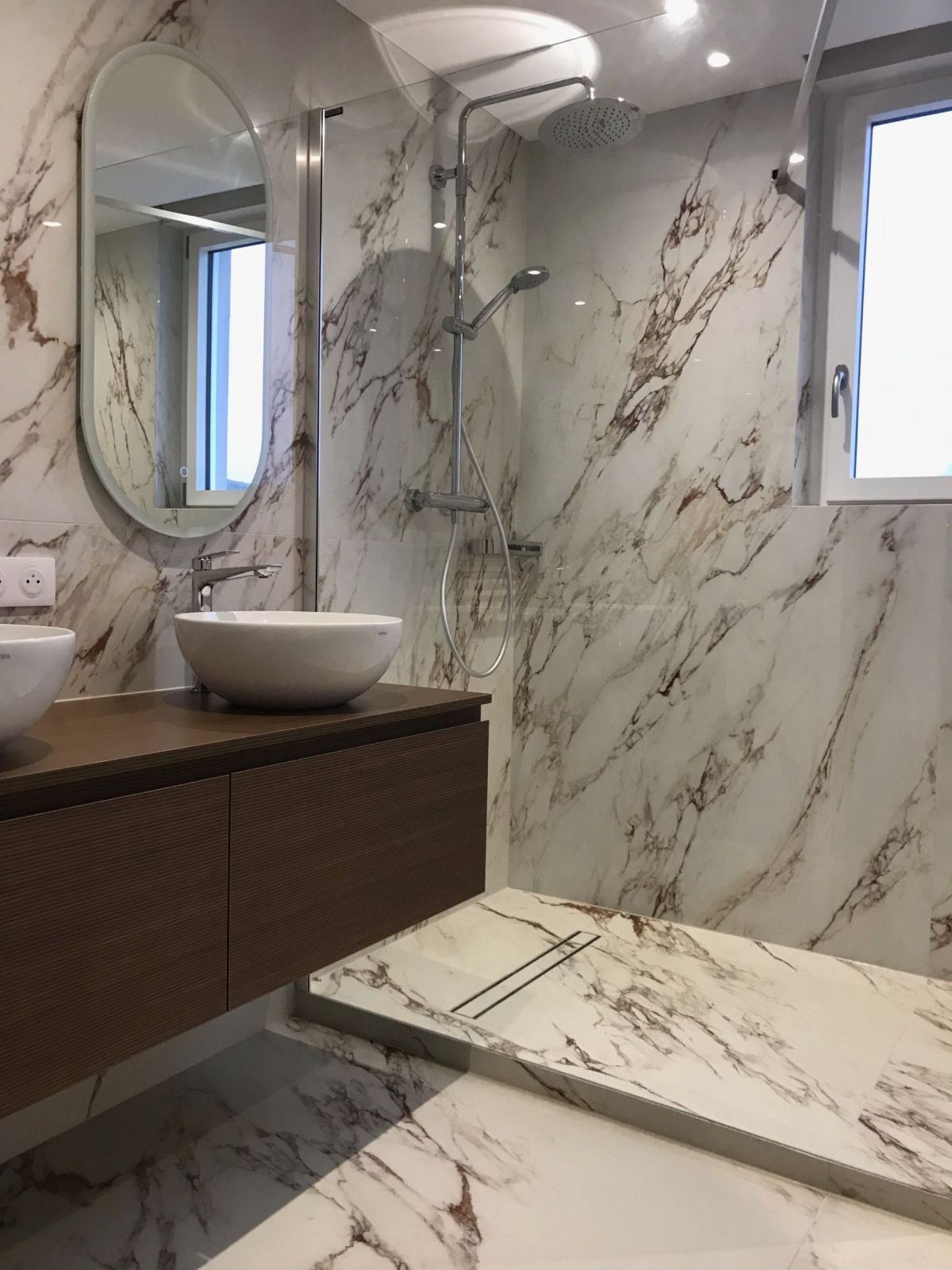GERBER SAS a réalisé cette salle de bain en misant sur l’élégance intemporelle du marbre. Le choix du carrelage Capraia série Sunshine , posé dans l’ensemble de la pièce, confère un caractère prestigieux et lumineux à l’espace.