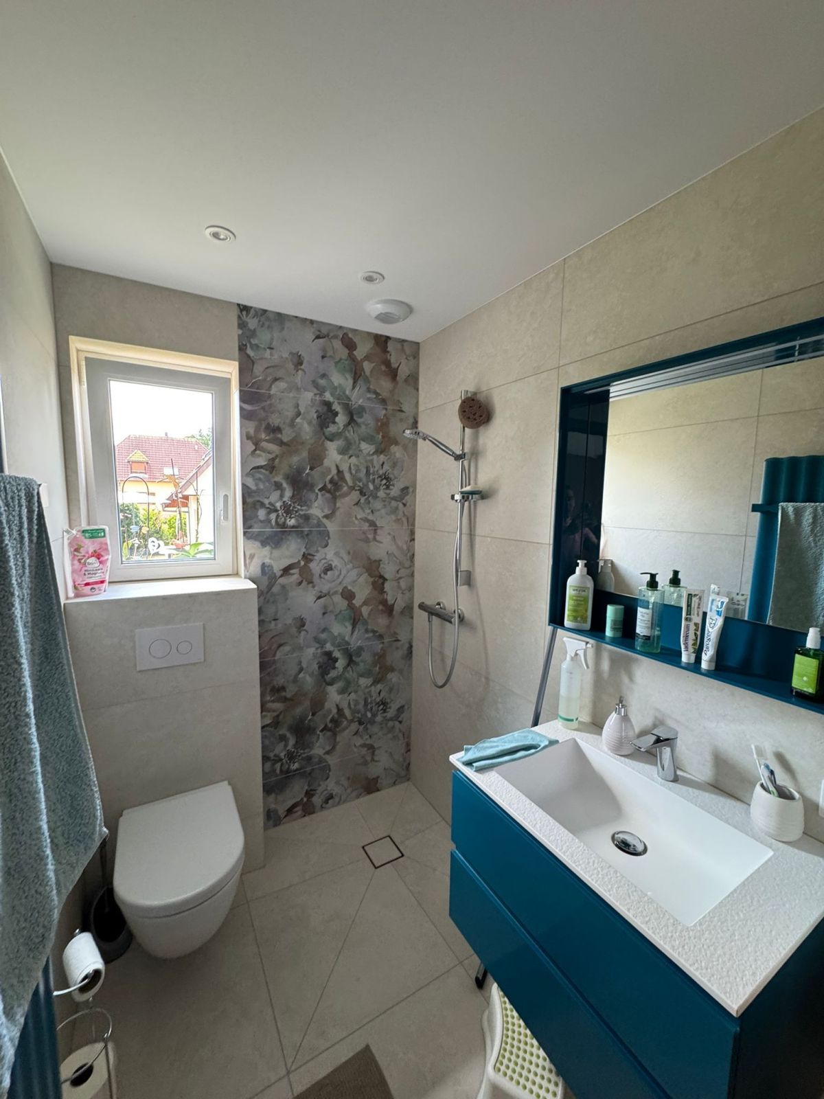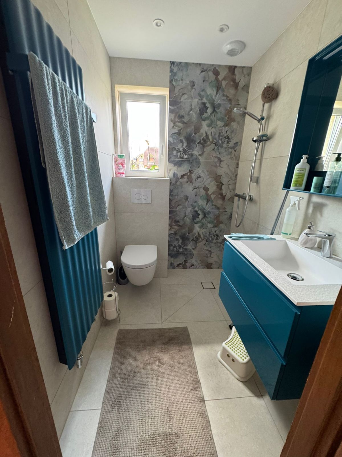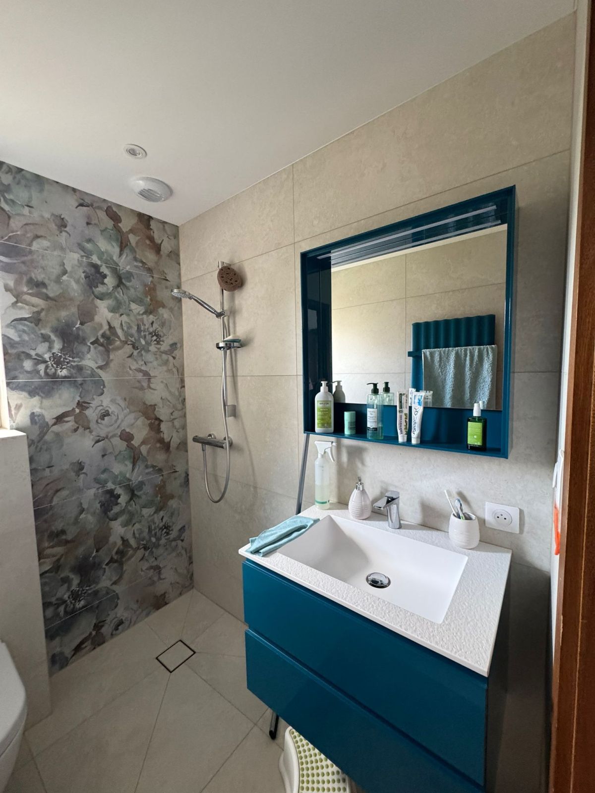 Rénovation de salle de bain moderne avec meuble bleu canard et carrelage floral