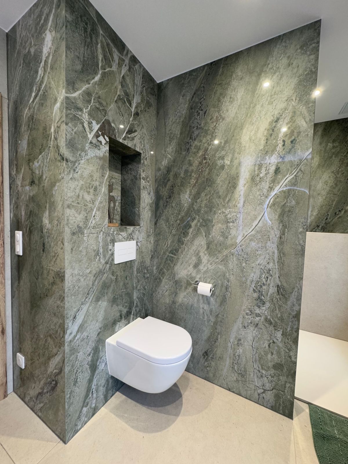 Rénovation de salle de bain haut de gamme avec plaques grand format effet marbre
