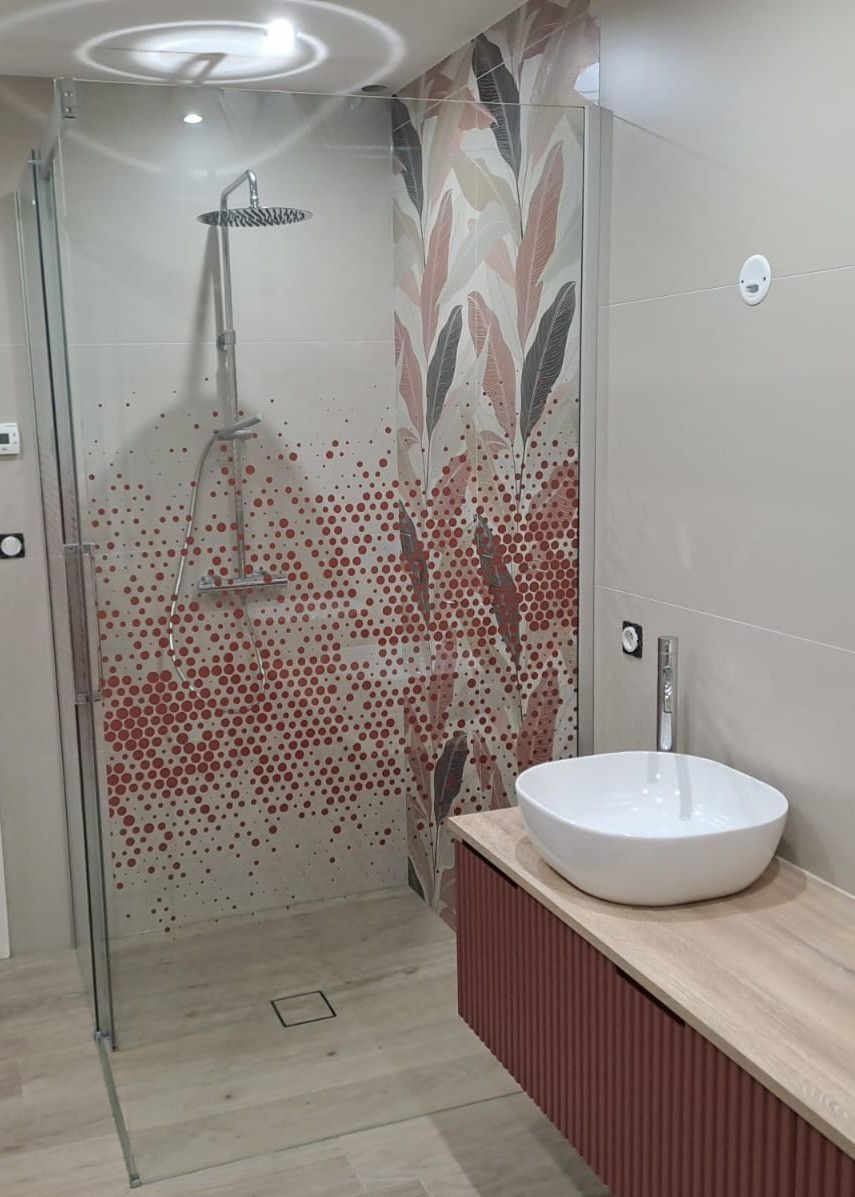 - Une douche graphique sublimée par un décor aux nuances rosées sur la paroi, véritable signature visuelle du projet