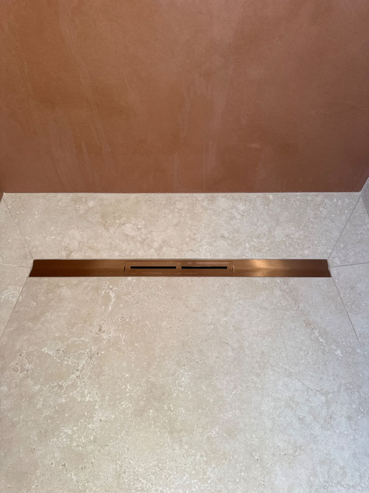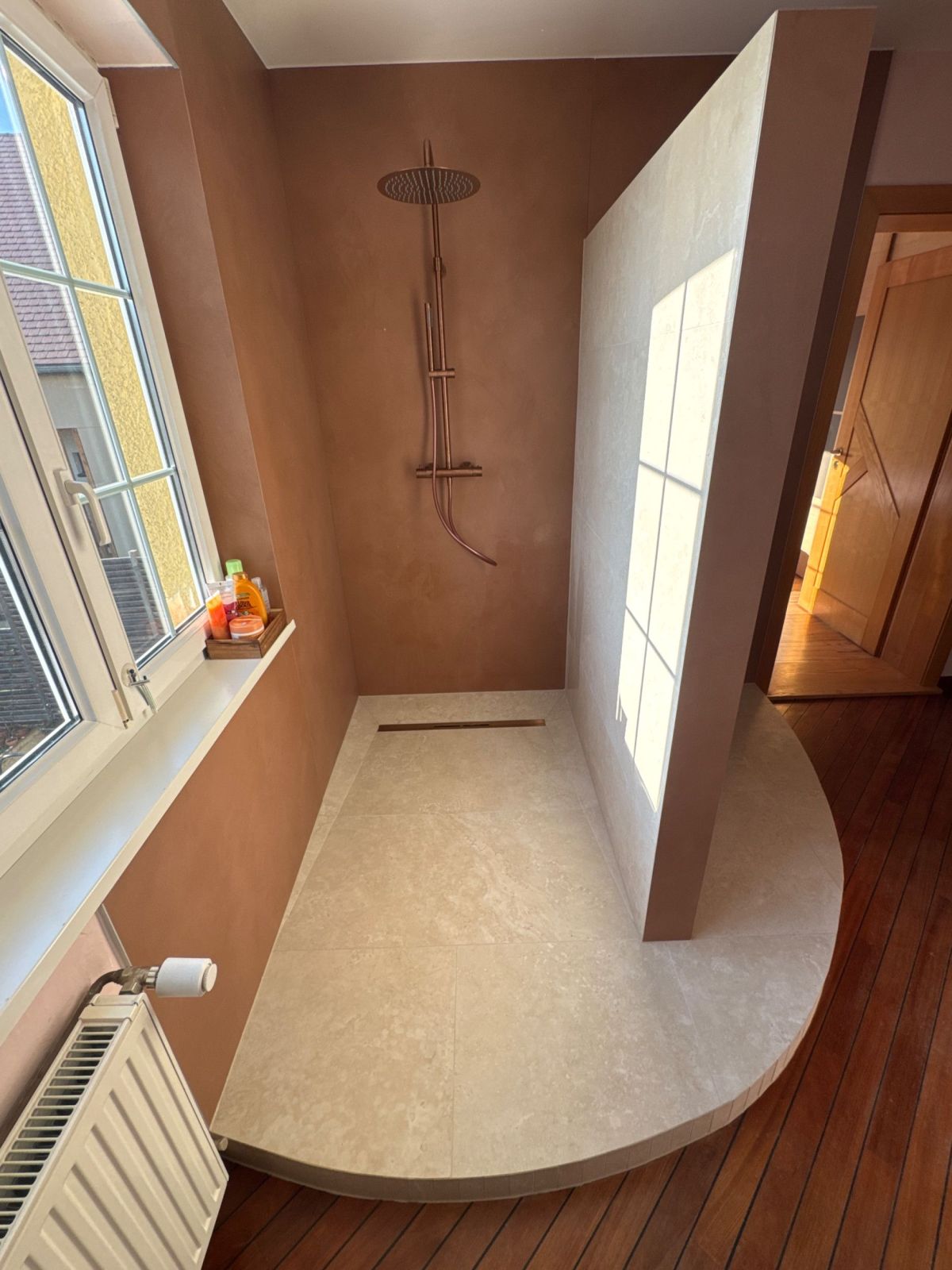 Création d’un receveur sur mesure en courbe, carrelé en grand format effet pierre beige