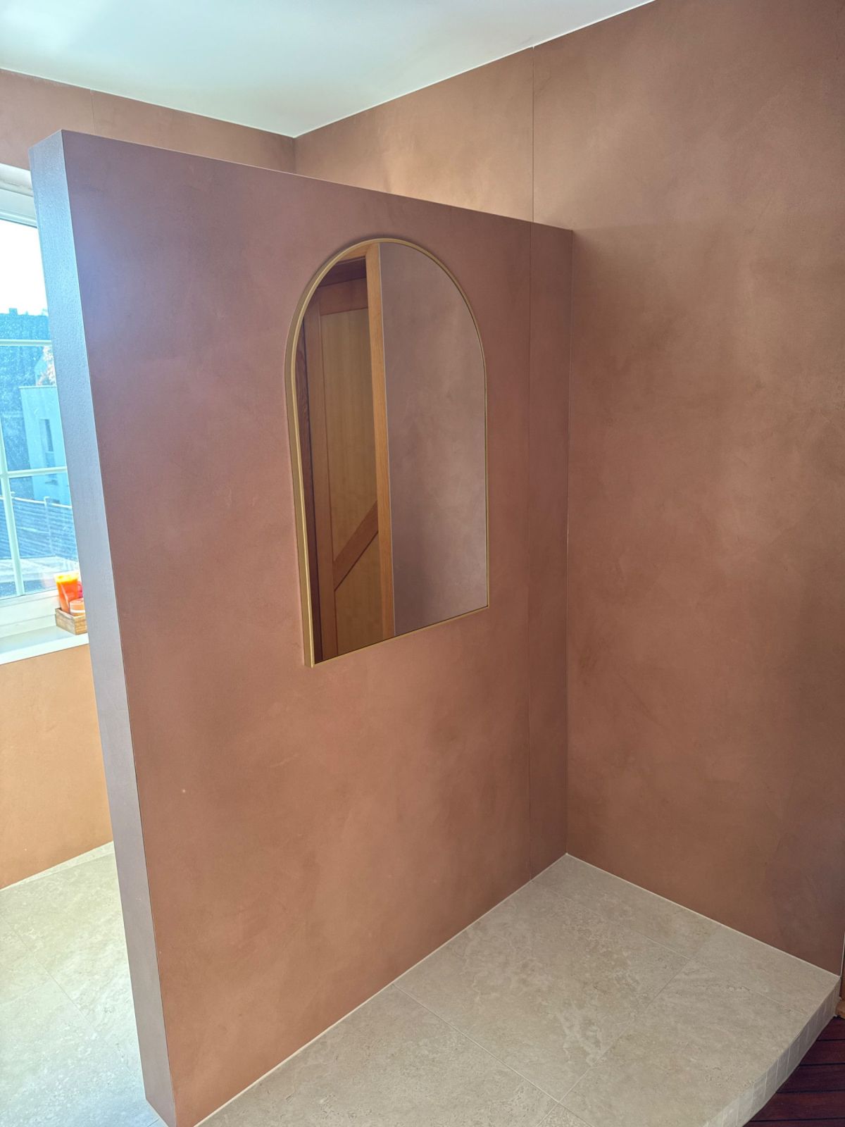 Pose de grandes plaques de grès cérame terracotta sur les murs pour une ambiance méditerranéenne